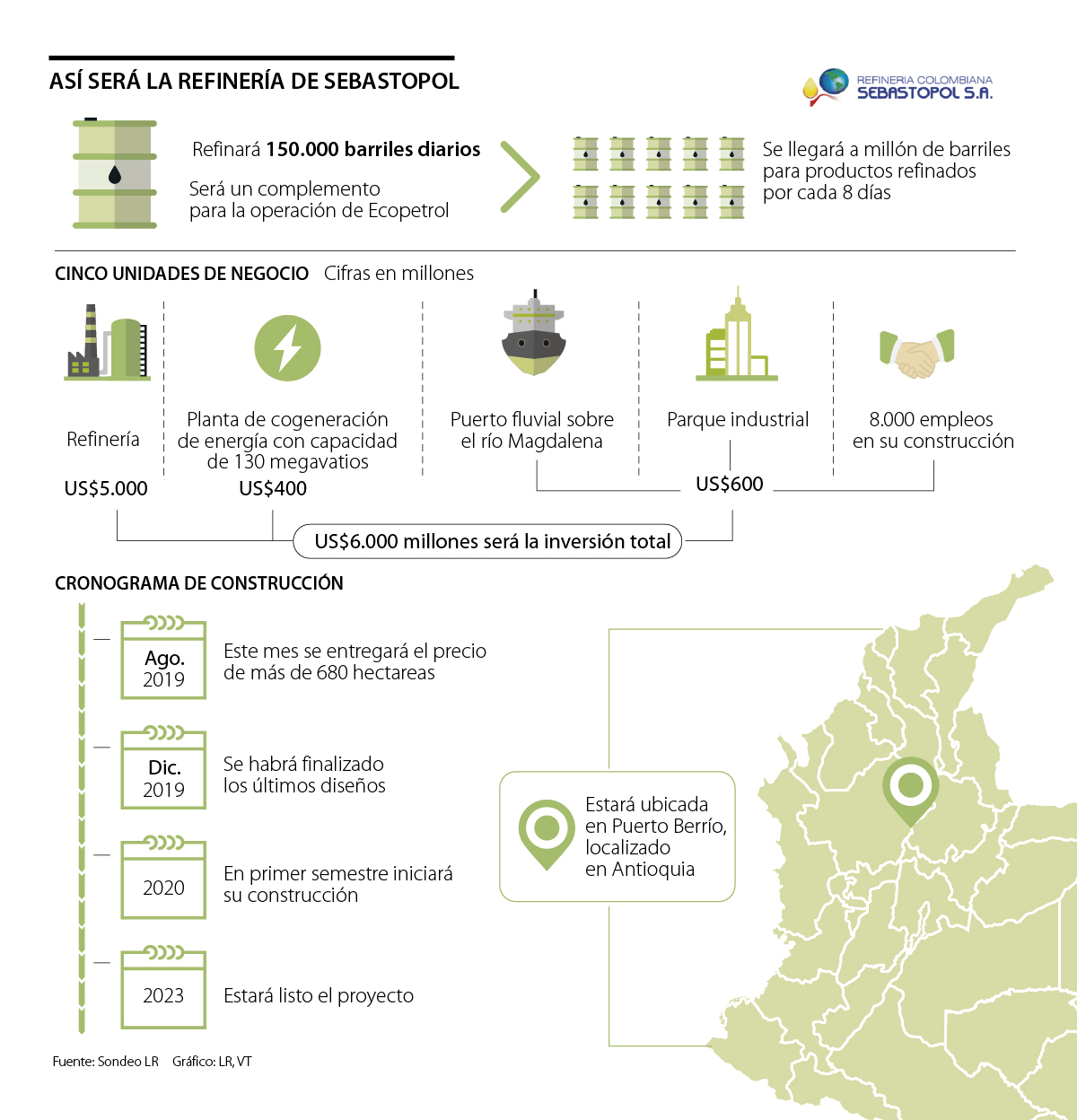 Con una capacidad para procesar hasta 150.000 barriles diarios, la Refinería Colombiana Sebastopol iniciará su construcción a más tardar en el primer trimestre de 2020. Tras concretar la viabilidad de los recursos con V.I.P Group International, un fondo de inversión privado con sede en Estados Unidos, se prevé que el proyecto tendrá un periodo de desarrollo de hasta tres años, por lo que, según sus inversionistas, podría entrar en operación a más tardar en 2023.