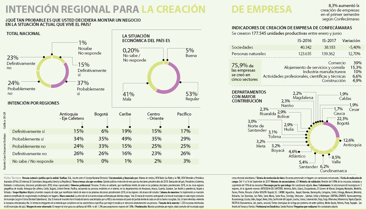 Así lo reveló La Gran Encuesta Elecciones Presidenciales 2018 elaborada por Yanhaas y presentada por La República, en alianza con RCN Radio, La FM, RCN Televisión, El País, El Universal, El Colombiano y Vanguardia Liberal, pues en el Caribe, 49% de los encuestados dijo que probablemente sí montaría un negocio y 19% afirmó que definitivamente lo haría, para un total de 68% de intención favorable.