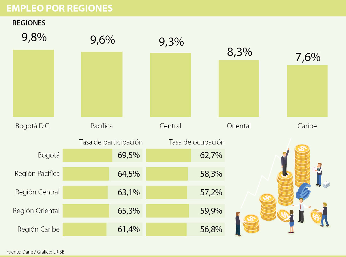 En el Caribe, la población económicamente activa es 5,07 millones de personas, y de ellos, 4,69 millones están ocupados. En otras regiones como la Pacífica, la segunda con el desempleo más alto (9,6%), 3,96 millones de 4,38 millones personas económicamente activos están ocupados, mientras que en Bogotá 4,16 millones de personas figuran como ocupadas frente a 4,62 millones que podrían estar trabajando.