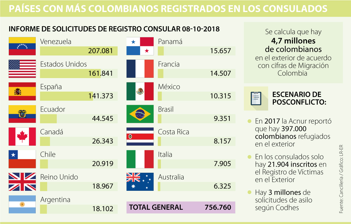 El país que reporta más colombianos inscritos en el Registro Consular es Venezuela, con 207.081 personas, seguido por EE.UU., con 161.841 colombianos, España con 141.373 personas, Ecuador (44.545) y Canadá (26.343).