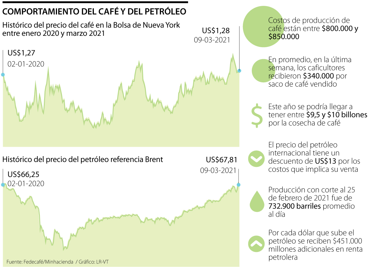 Y es que la semana anterior se alcanzaron precios históricos tanto en el grano como en el petróleo. En primer lugar, el precio del café en la Bolsa de New York se cotizó a un precio que no se veía desde septiembre del año pasado al ubicarse en US$1,36 y en el petróleo de referencia Brent el precio máximo que tocó fue de US$68, una cifra que no se veía desde los primeros días de enero de 2020.