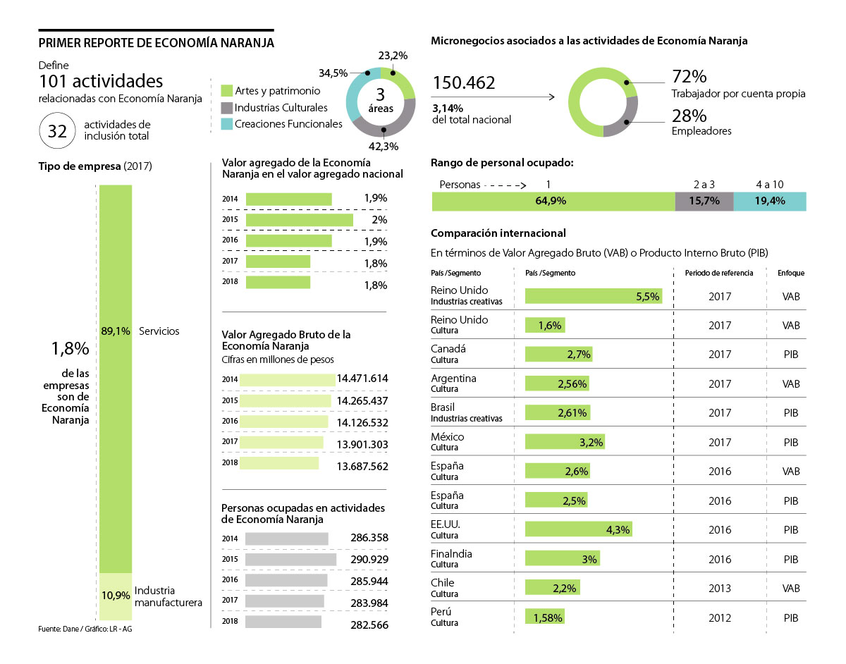 En el ‘Primer Reporte de Economía Naranja (2014-2018)’ la entidad delimita 32 actividades económicas referentes a este concepto, y 69 adicionales que tienen una inclusión total en estas industrias, que según el Dane se definen como aquellas actividades “que de manera encadenada permiten que las ideas se transformen en bienes y servicios culturales, cuyo valor está determinado por su contenido de propiedad intelectual”.