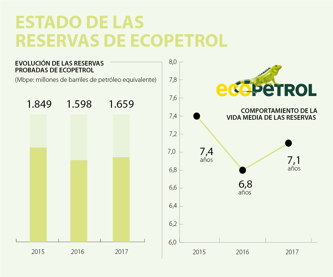 Al cierre de 2017, las reservas probadas netas del Grupo Ecopetrol llegaron a 1.659 millones de barriles de petróleo equivalentes. El índice de reemplazo de las reservas fue de 126% y la vida media de las reservas equivale a 7,1 años, según anunció la petrolera hoy.