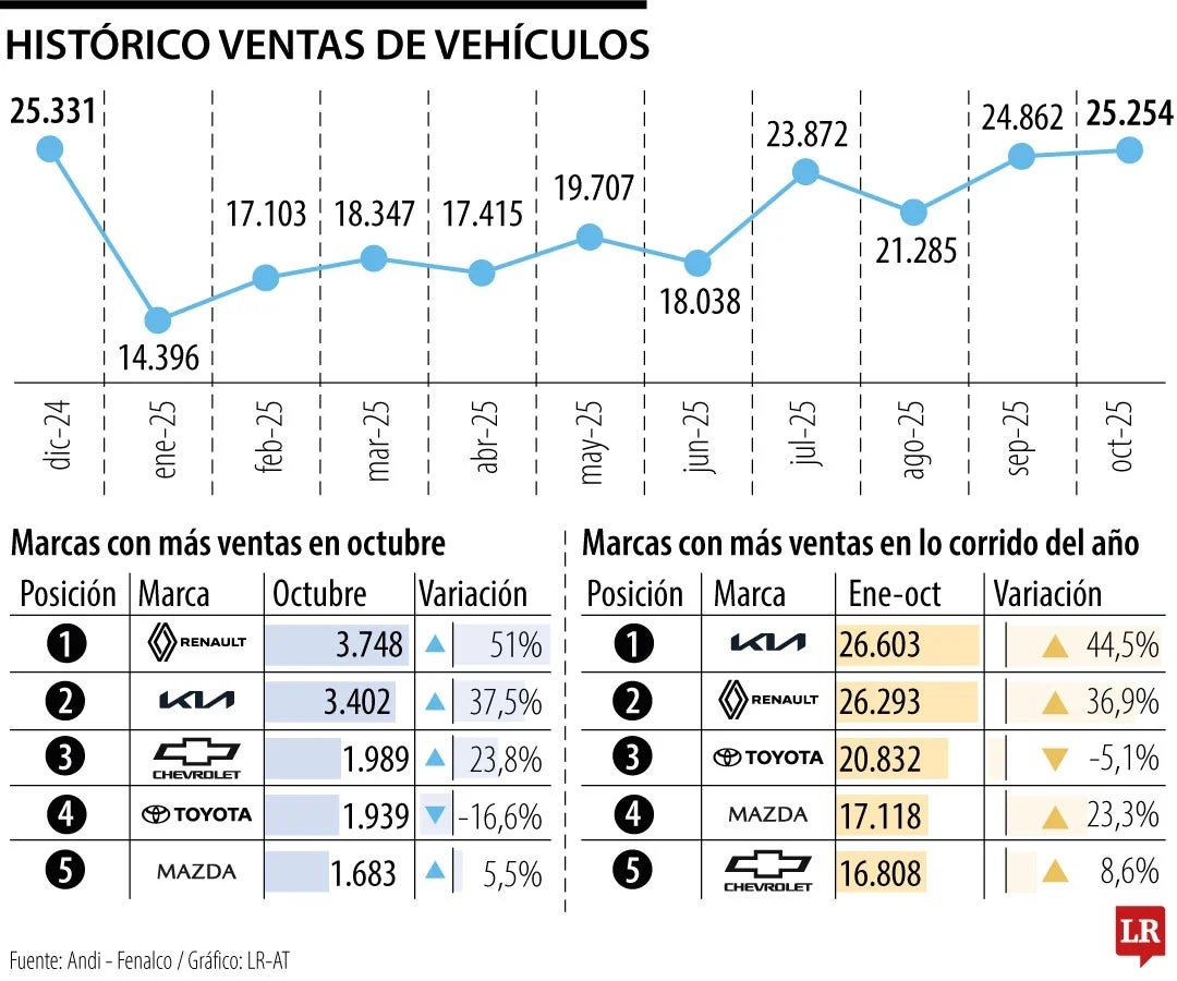 De acuerdo con un informe de la Andi y Fenalco, en octubre se matricularon 25.254 carros, lo que significó un crecimiento de 36,4% frente al mismo mes de 2024 y se convirtió en el mes de mayor volumen de vehículos vendidos en lo corrido del año.