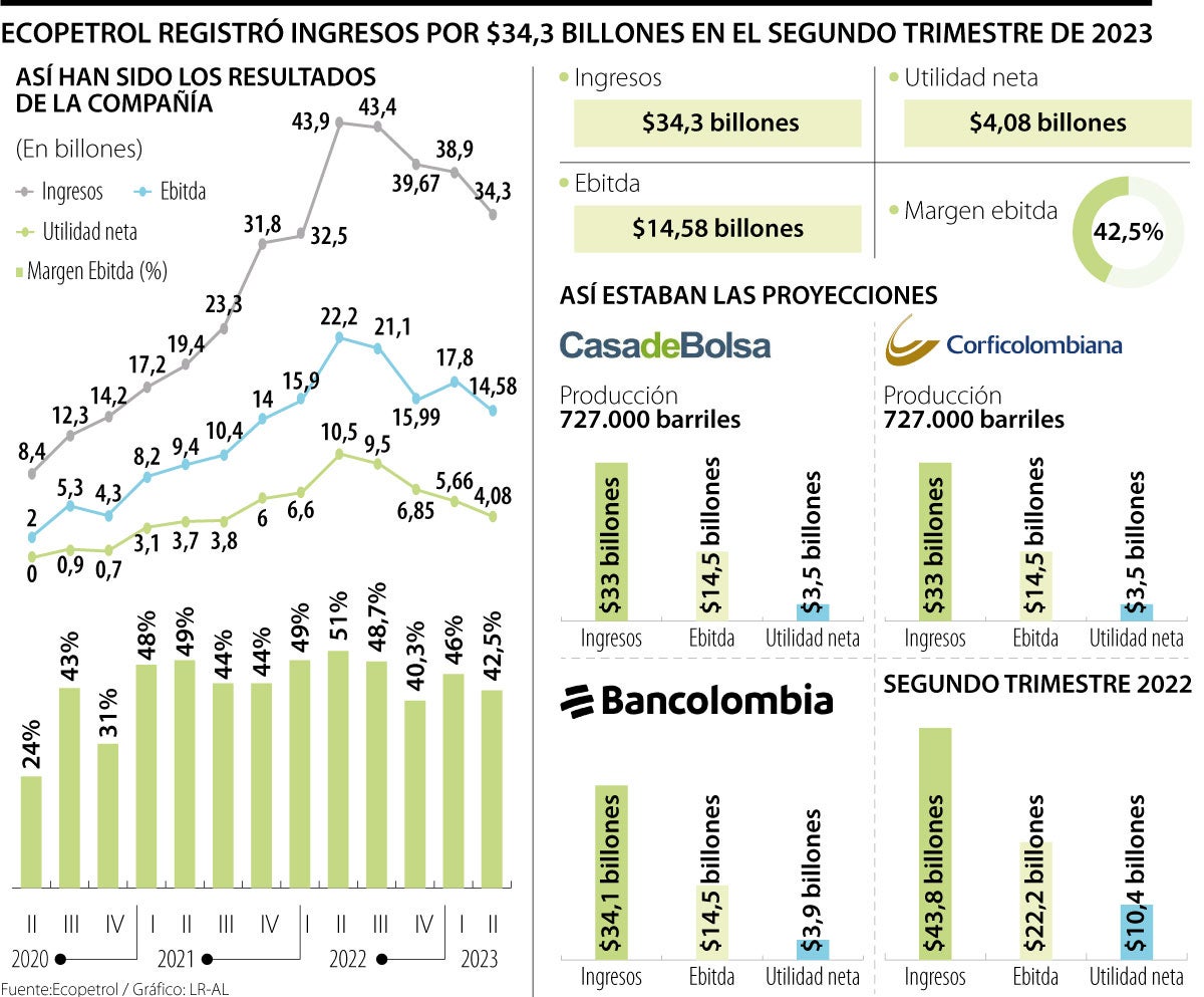 Los ingresos totales de la compañía más grande del país para ese periodo de tiempo sumaron $34,3 billones, lo que acumula $73,15 billones para el primer semestre. Mientras que las utilidades alcanzaron $4,08 billones este trimestre, para completar $9,74 billones semestrales, y el Ebitda fue de $14,6 billones con un margen de 42,5%, lo que reúne en este indicador para el semestre un monto de $32,42 billones con margen de 44,3%.