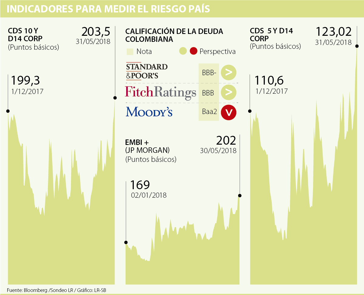 Y es que lejos de mejorar la percepción de riesgo de Colombia, gracias a la esperada llegada al poder de un candidato ‘promercado’ afín a los empresarios, las firmas calificadoras y los inversionistas, el Embi + y los Credit Default Swaps (CDS) a 10 años, que son los principales medidores de la capacidad de pago, han subido en los últimos días. El primero aumentó 12,2% en mayo, mientras que el alza del segundo fue de 10,3%. Además, ambos se ubican sobre los 202 puntos.