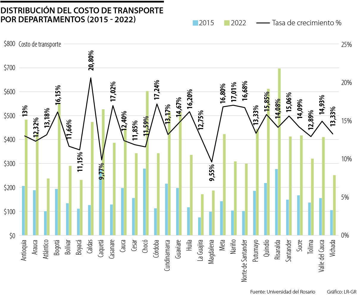 La evolución histórica de los costos de carga de transporte de 2015 a 2022, muestra una tendencia uniforme en todos los departamentos. Caldas y Córdoba sobresalen por sus marcados crecimientos interanuales en costos, con incrementos de 20,8% y 17,24 %, respectivamente. En contraste, Magdalena y Caquetá presentan los menores aumentos interanuales, con tasas de crecimiento de 9,77% y 9,55%.