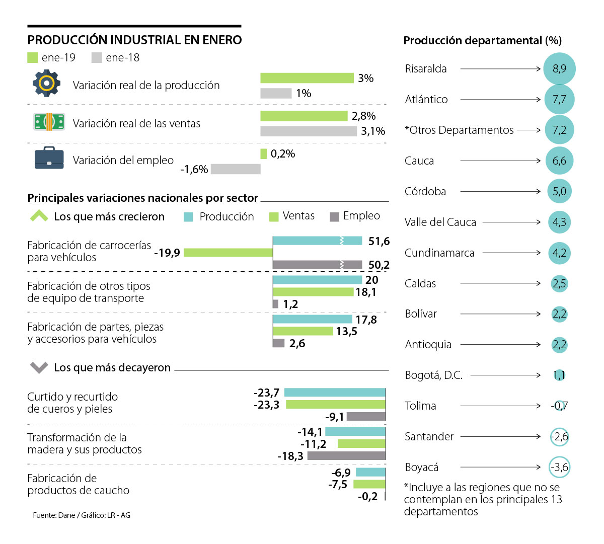 Por regiones, Risaralda figura como el departamento con el mayor crecimiento industrial en el primer mes del año, con una variación de 8,9% en comparación con el mismo mes de 2018. Si bien las ventas tuvieron un retroceso de 2,5%, el empleo en el sector reportó un aumento de 0,1%.