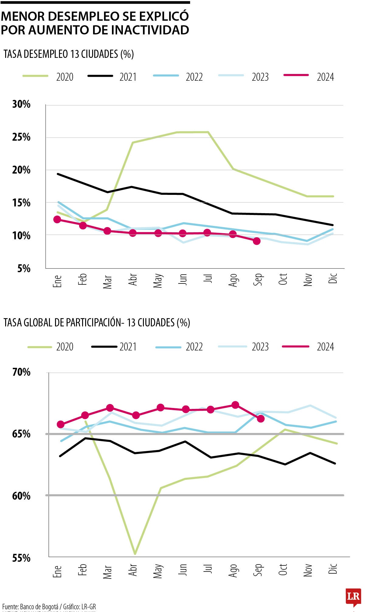 Un informe reciente del área de Investigaciones Económicas y Análisis de Mercado del Banco de Bogotá detalló que la tasa de desempleo en las principales ciudades del país fue de 9,2%, por debajo de la estimación promedio de los analistas, que era de 9,8%. Al revisar la serie ajustada por efectos estacionales (SA), se observó que la tasa de desempleo nacional bajó de 10,0% en agosto al 9,8% en septiembre, alcanzando su nivel más bajo desde agosto de 2023.