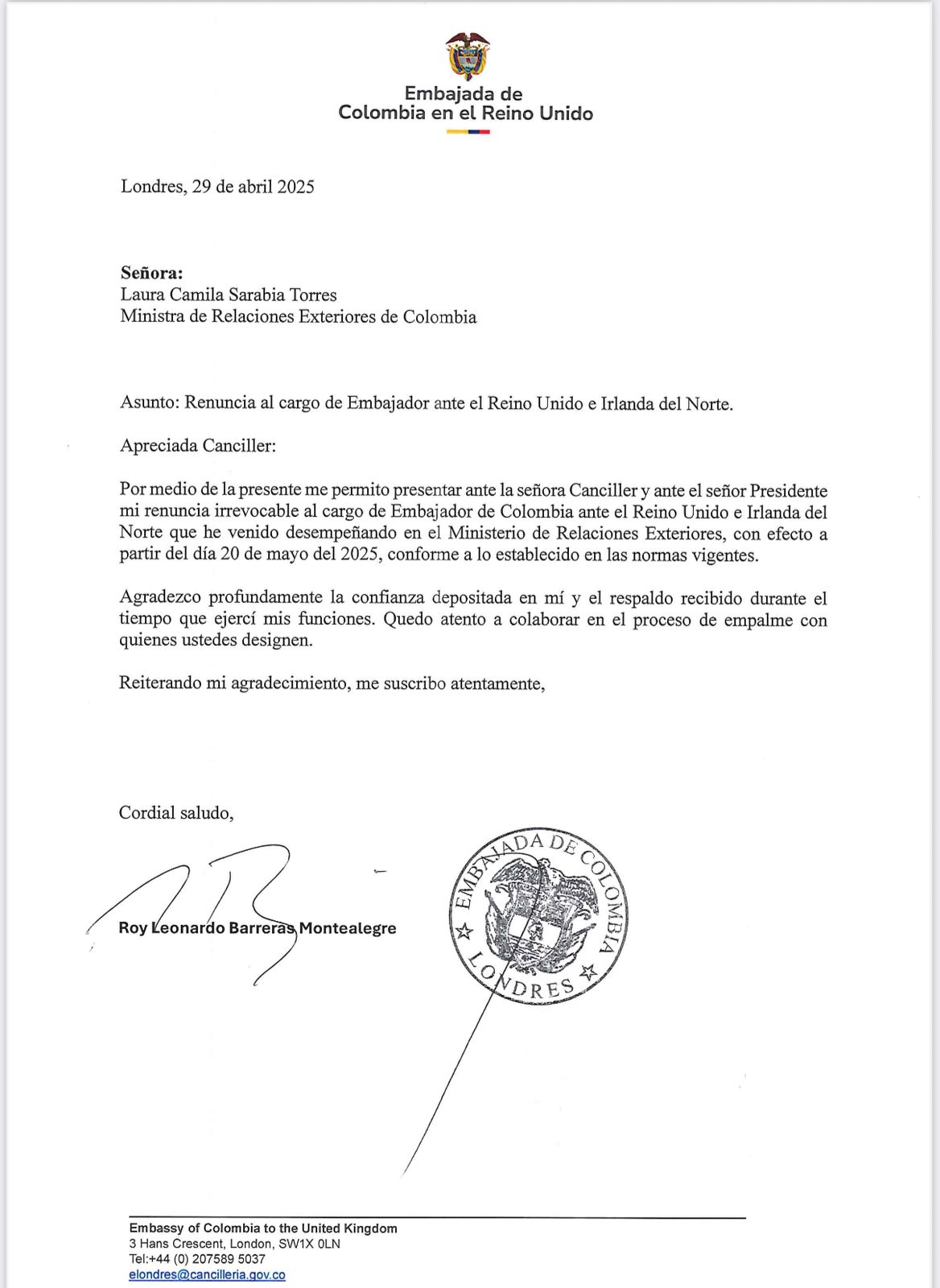 Aunque no se ha hecho oficial, ya se divulgó la carta que Barreras le presentó a la canciller Laura Sarabia, aparentemente esta información se la había comunicado semanas antes. Barreras informó que ofrecería la renuncia a finales de abril y se separaría formalmente del cargo el 20 de mayo.