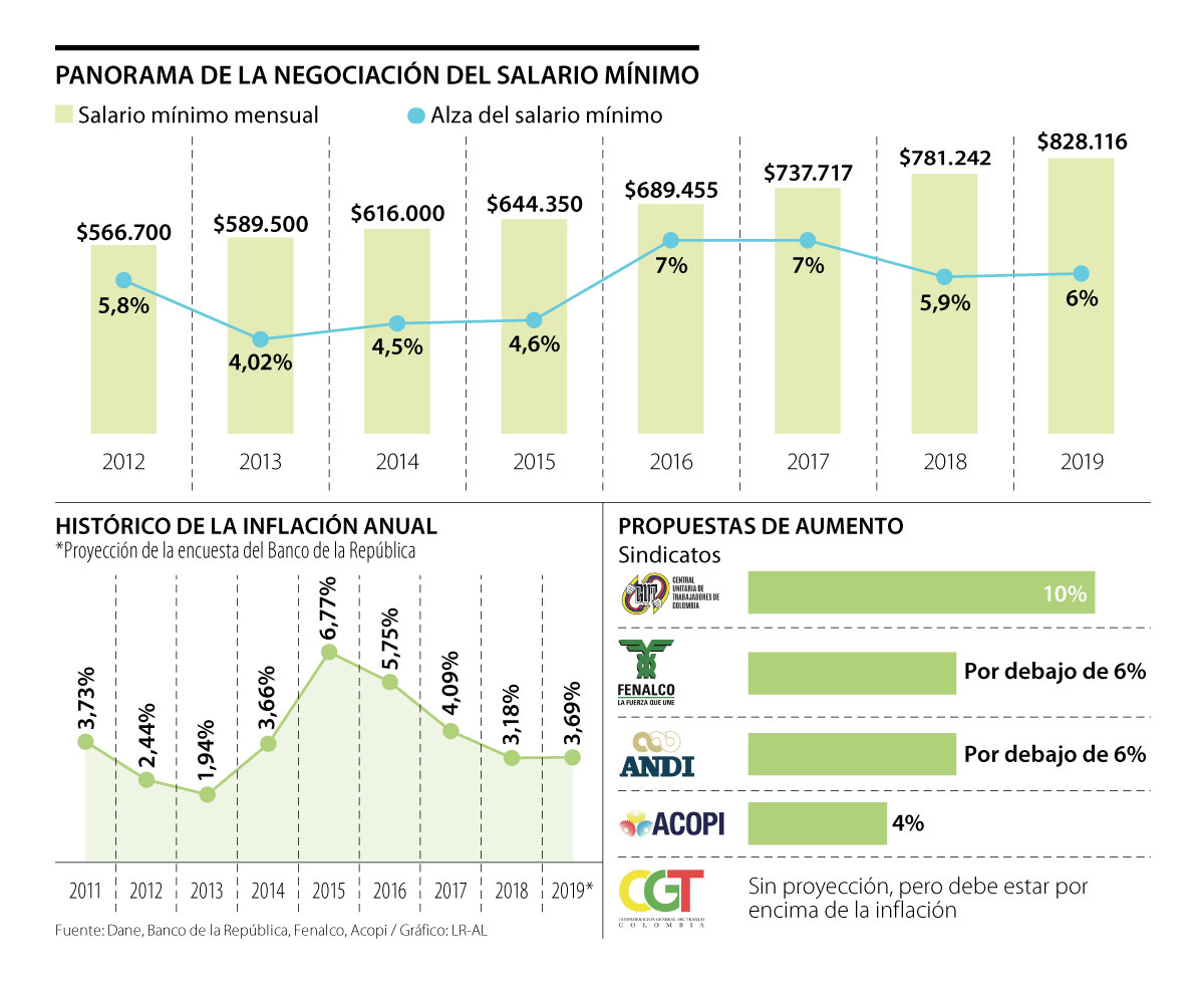 Londoño aseguró que, debido a la tasa de desempleo que se ubica en 10,8%, no se está considerando “otro esfuerzo por parte del sector público ni de los empresarios de un aumento significativo por encima de la inflación”. Gremios como la Andi, Fenalco y Acopi coinciden con la postura del Gobierno, mientras que la Central Unitaria de Trabajadores (CUT) y la Confederación General del Trabajo (CGT) tienen proyecciones diferentes.