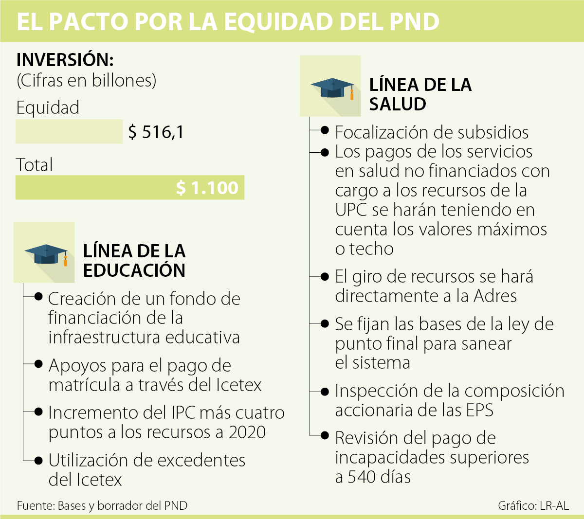 En la línea de la salud, el Plan incluye algunas de las bases de la denominada ley de punto final que buscará en adelante sanear las deudas de los principales actores del sistema, pues según la Asociación Colombiana de Hospitales y Clínicas (Achc) la deuda que asfixia a los hospitales ya va por $9,2 billones.