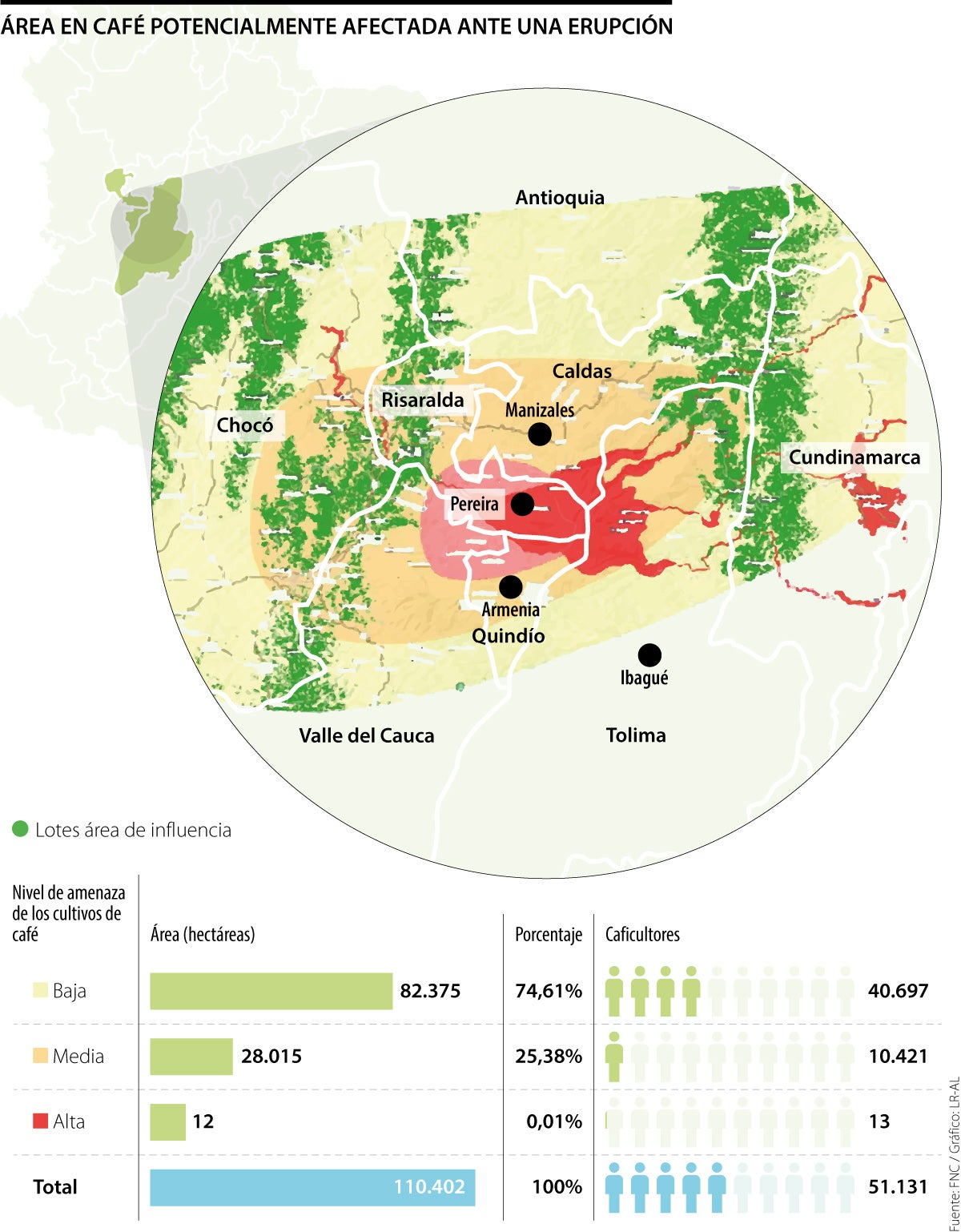 Y explica, mediante un mapa de amenaza, que la caficultura de los departamentos de Tolima, Caldas, Risaralda, Quindío, y Valle del Cauca tendrían efectos de los materiales emanados del volcán. Por departamentos, Caldas y Risaralda son las zonas con alerta de alta amenaza, siendo 10 hectáreas para Caldas, y 2 para Risaralda.