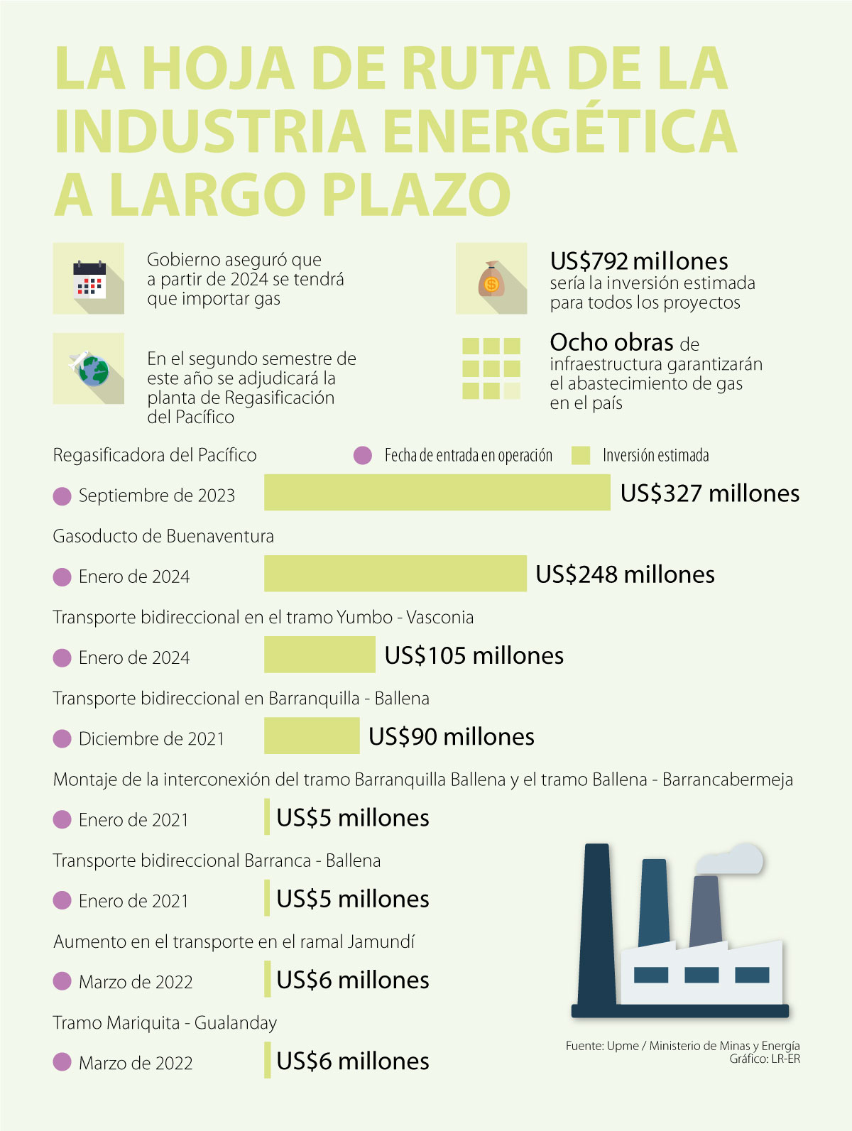 Las alertas sobre el abastecimiento de este combustible surgen luego de que la Unidad de Planeación Minero – Energética (Upme) revelara los escenarios a los que se podría enfrentar el país en el mediano y largo plazo. El panorama, que se detalla en los más recientes documentos del Plan Nacional Energético y el Plan de Abastecimiento de Gas, señalan que serán necesaria la planta de Regasificación del Pacífico, así como siete obras más que conectarán el centro del país con el norte y el suroccidente.