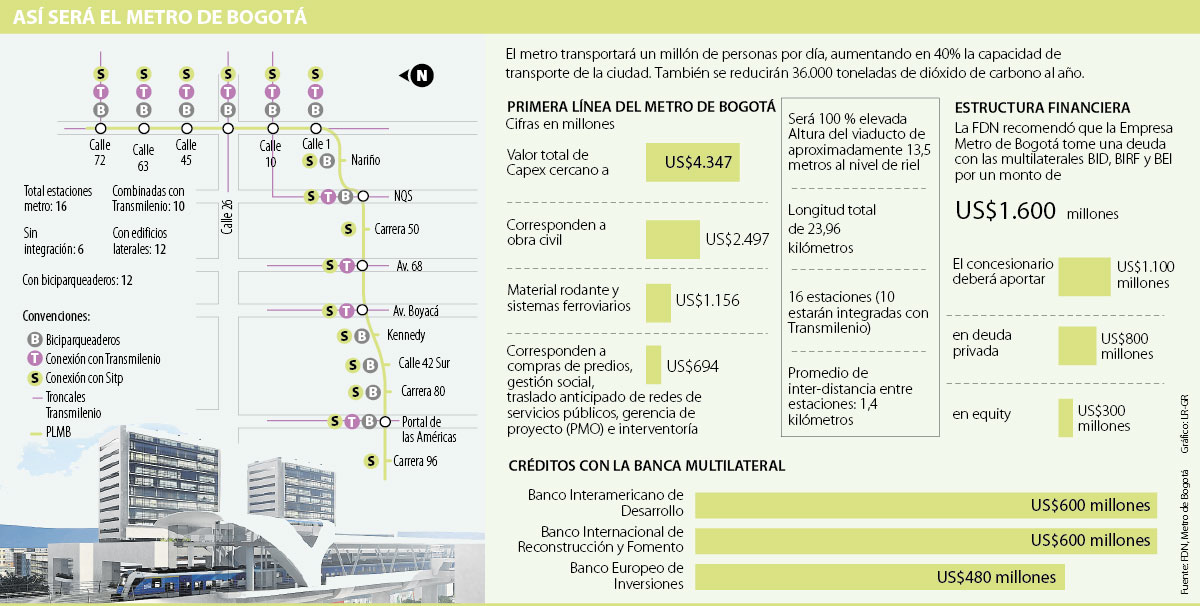 Como una manera de celebrar el cumpleaños número 480 de Bogotá, el alcalde de la capital, Enrique Peñalosa, y el entonces presidente de la República, Juan Manuel Santos, abrieron la licitación para la primera línea del metro de Bogotá, que tendrá una longitud comercial de 23,96 kilómetros, constará de 16 estaciones y costará alrededor de US$4.400 millones.