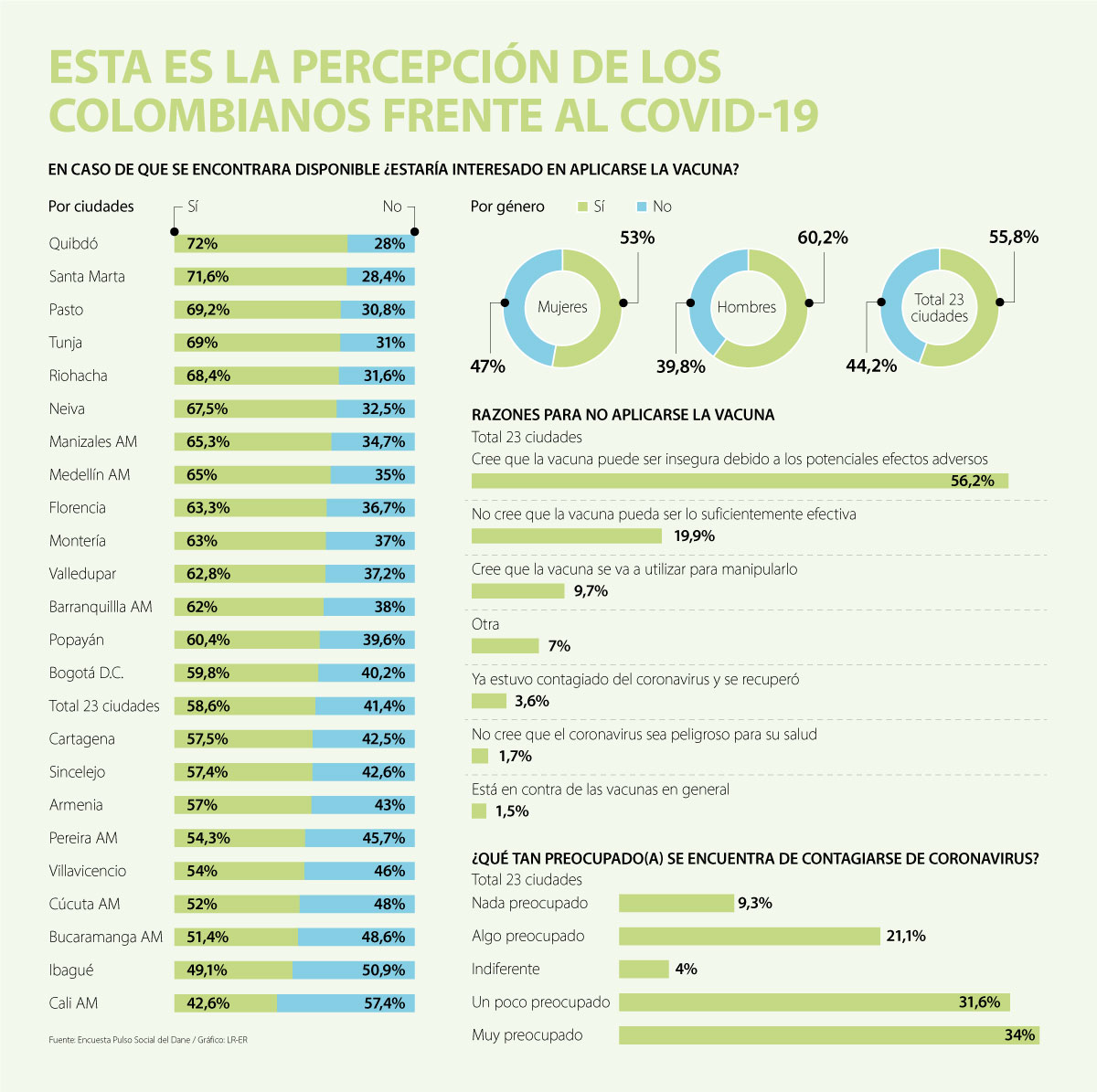 Ayer, el Dane presentó una nueva entrega de la encuesta (la de noviembre) y uno de los capítulos relacionados con el covid-19 llamó la atención y fue cuando preguntaron si las personas se pondrían la vacuna.