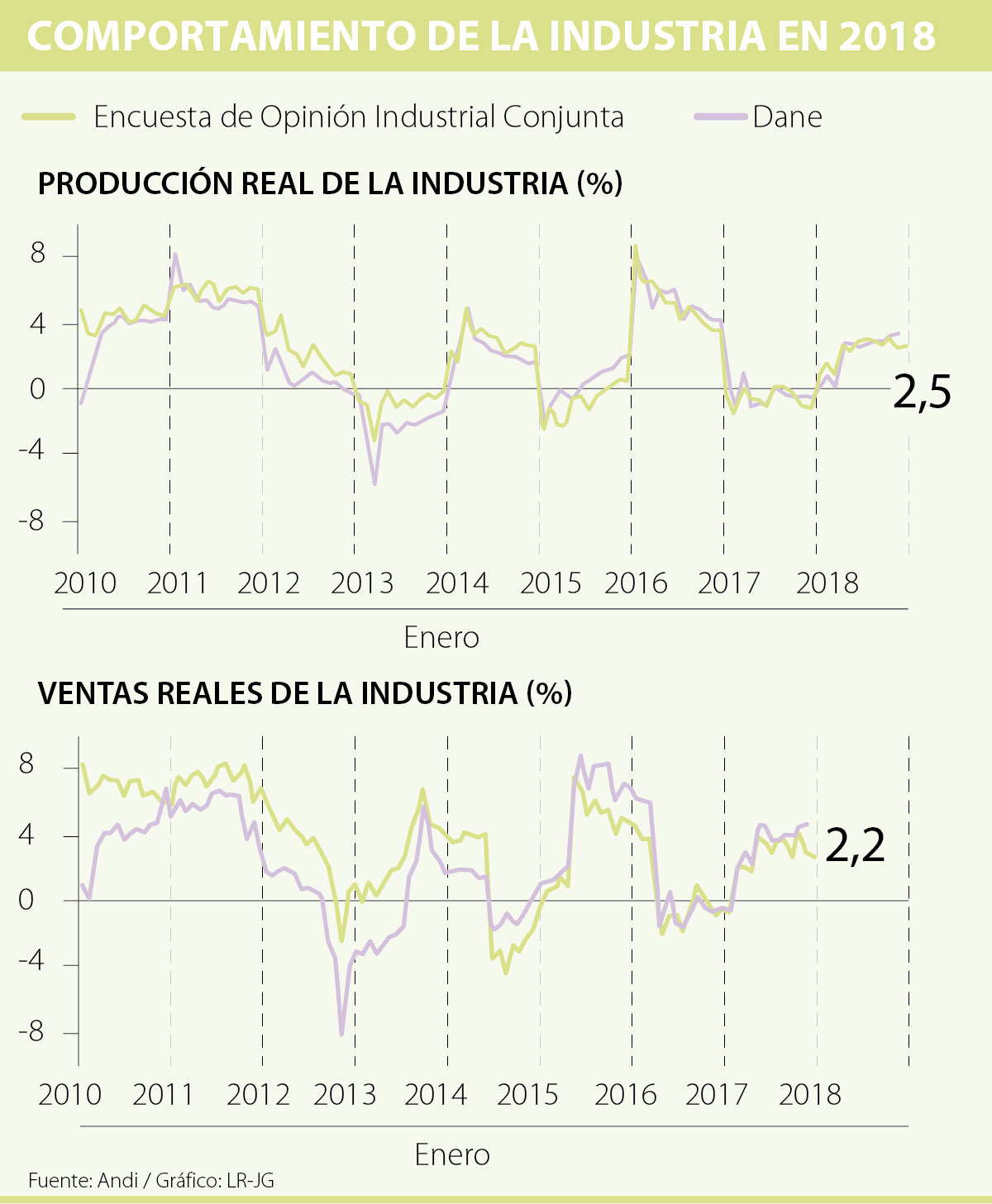 “El crecimiento de 2,5% es un indicador importantísimo, mucho más, cuando se ve lo que pasó en 2017, que terminamos con un decrecimiento de 1,1%. Es importante rescatar, además, que solo dos sectores no tienen el mismo comportamiento de resto (otros productos químicos y productos minerales no metálicos, que decrecieron 3%, respectivamente)”, indicó Bruce Mac Master, presidente de la Asociación Nacional de Empresarios de Colombia (Andi).