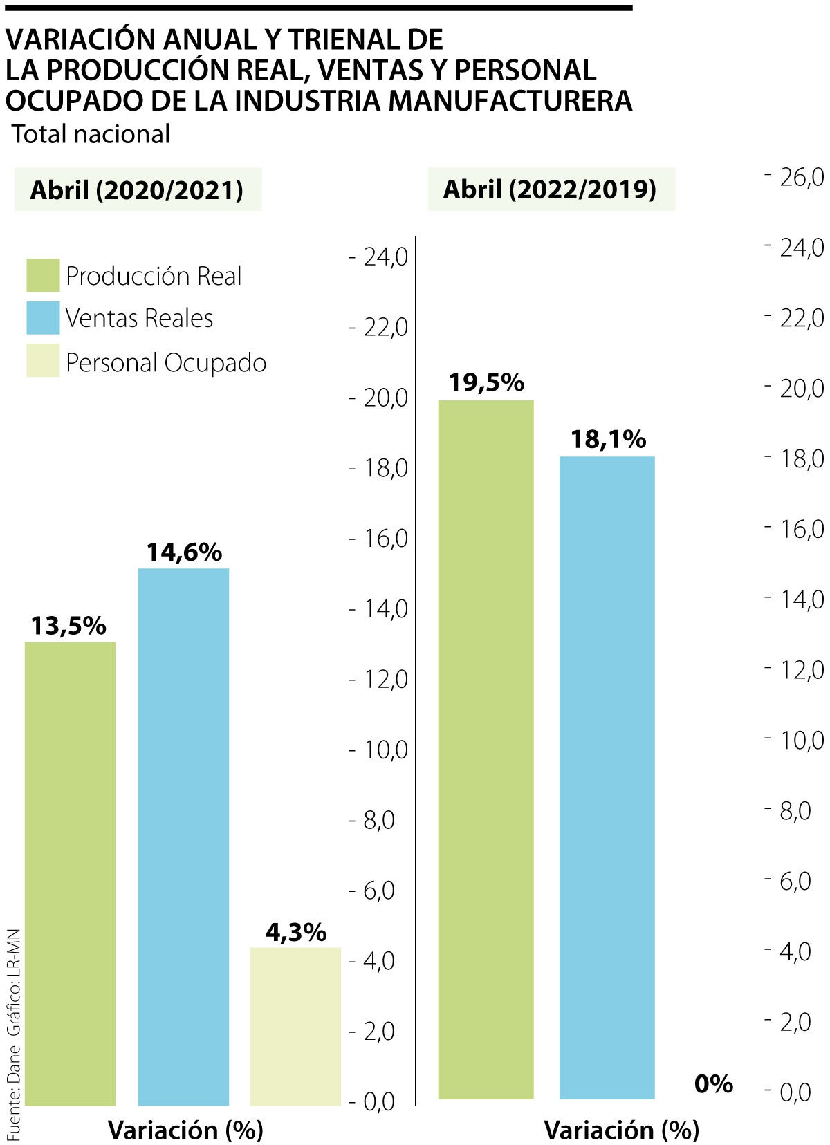 El director del Departamento Administrativo Nacional de Estadística, Dane, Juan Daniel Oviedo, reveló que durante abril de 2022 el crecimiento de la producción real manufacturera fue de dos dígitos, en este caso de 13,5% frente al mismo período en 2021, acompañado de un incremento del personal ocupado similar al del mes de marzo. Para el cuarto mes del año, este dato llegó a 4,3% y las ventas reales a 14,6%, según el informe.