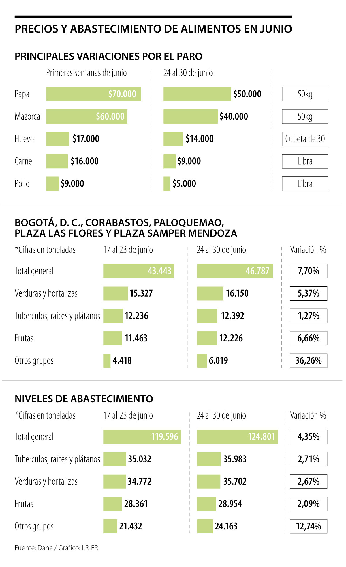 “Podemos decir que hemos visto una mejora en la papa, el arroz y hortalizas de hoja; durante el paro tuvimos semanas en las que el bulto de papa llegó hasta $70.000 y ya estamos viendo cómo el bulto se encuentra en $50.000 promedio. En el caso de la mazorca, vimos como hace unas semanas estaba en $60.000 los 50 kilos, hasta ahora vimos como su precio volvió a bajar ubicándose en $40.000 en promedio”, dijo Luis Hernando Ríos, jefe de mercadeo de la Corporación de Abastos de Bogotá (Corabastos).
