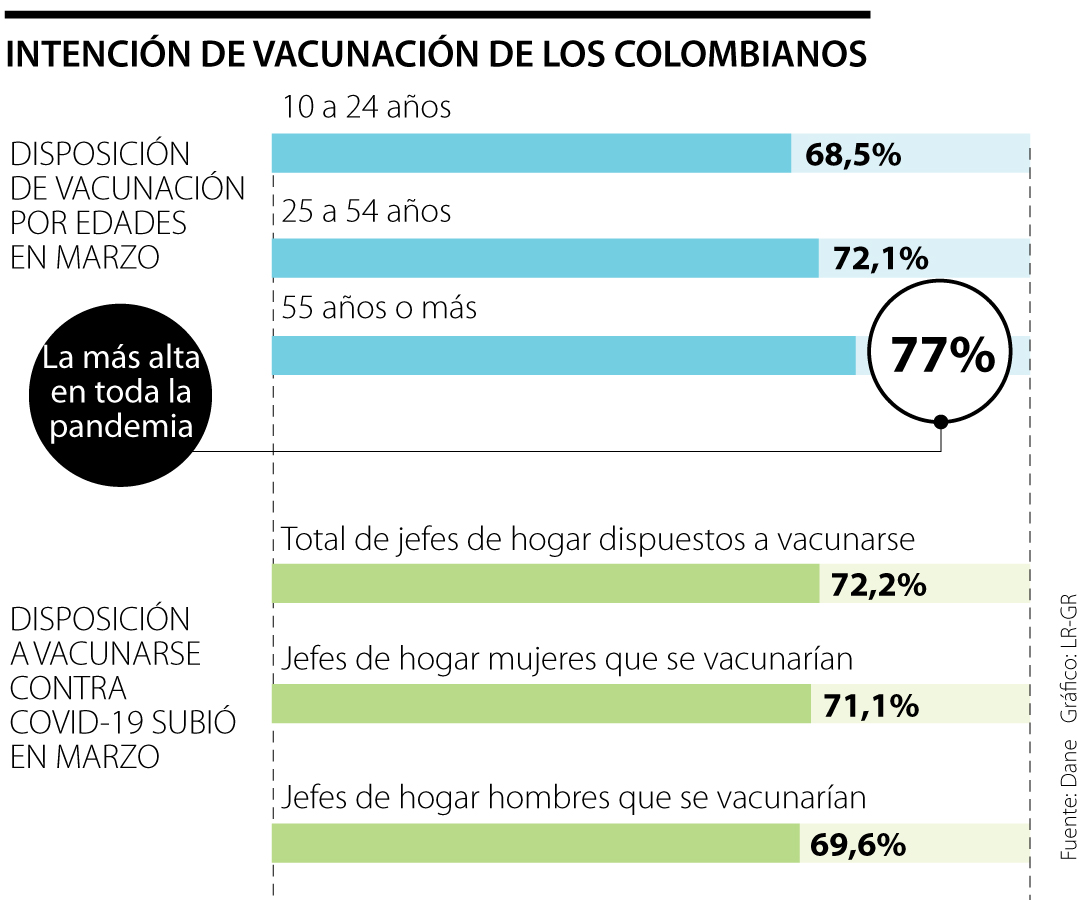 De otro lado, el Dane dio a conocer que la población de 55 años en adelante está más dispuesta a vacunarse que nunca, ya que 77% de los encuestados mostró su interés por acceder a las dos dosis cuando les sea permitido. En febrero este mismo grupo poblacional registró 72% de optimismo frente a las vacunas contra el covid-19.