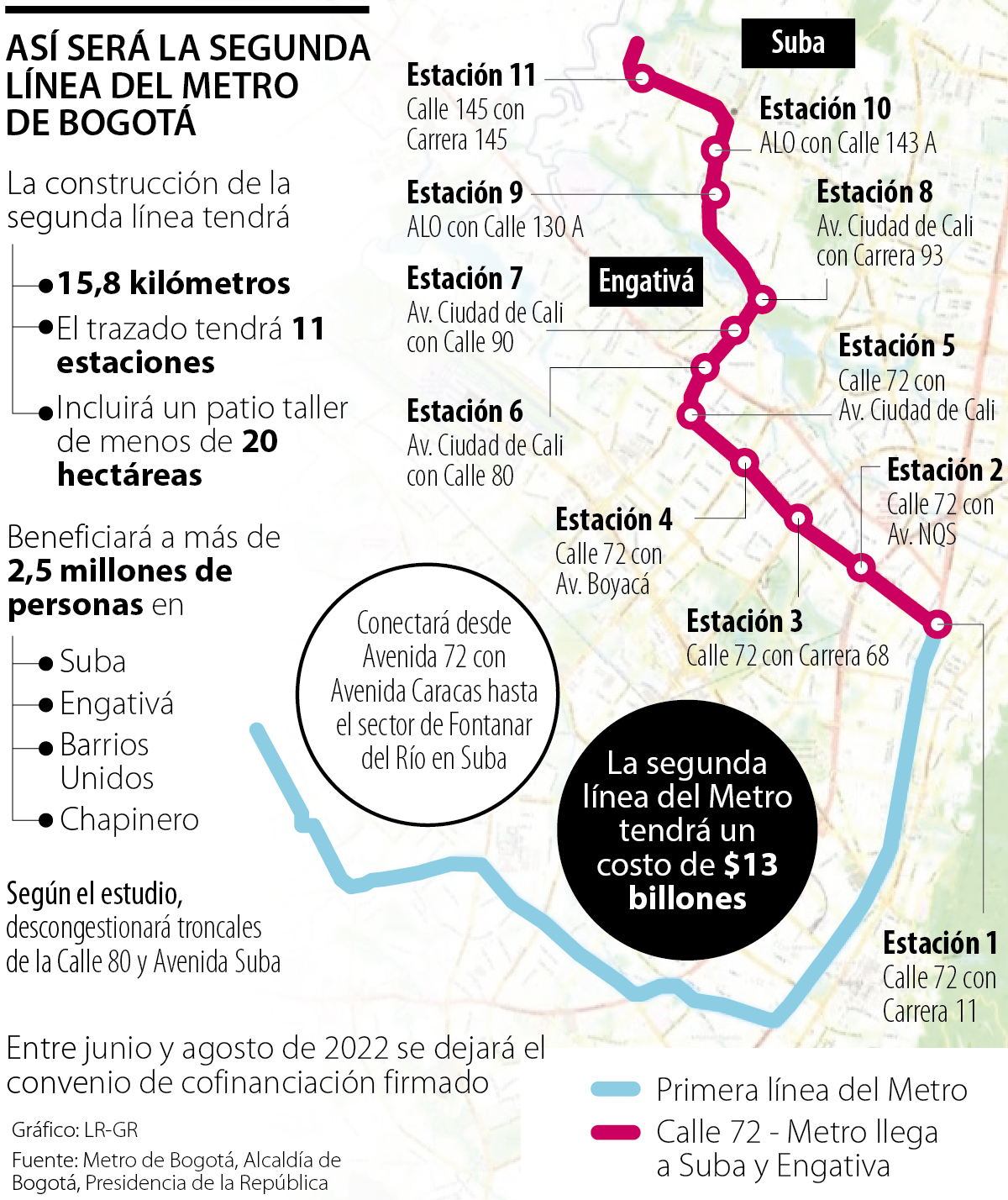 En un evento realizado en la localidad de Suba, el presidente de la República, Iván Duque, y la alcaldesa de Bogotá, Claudia López, confirmaron ayer la construcción de la Línea 2 del Metro de Bogotá, la cual será subterránea y tendrá un costo estimado de $13 billones.