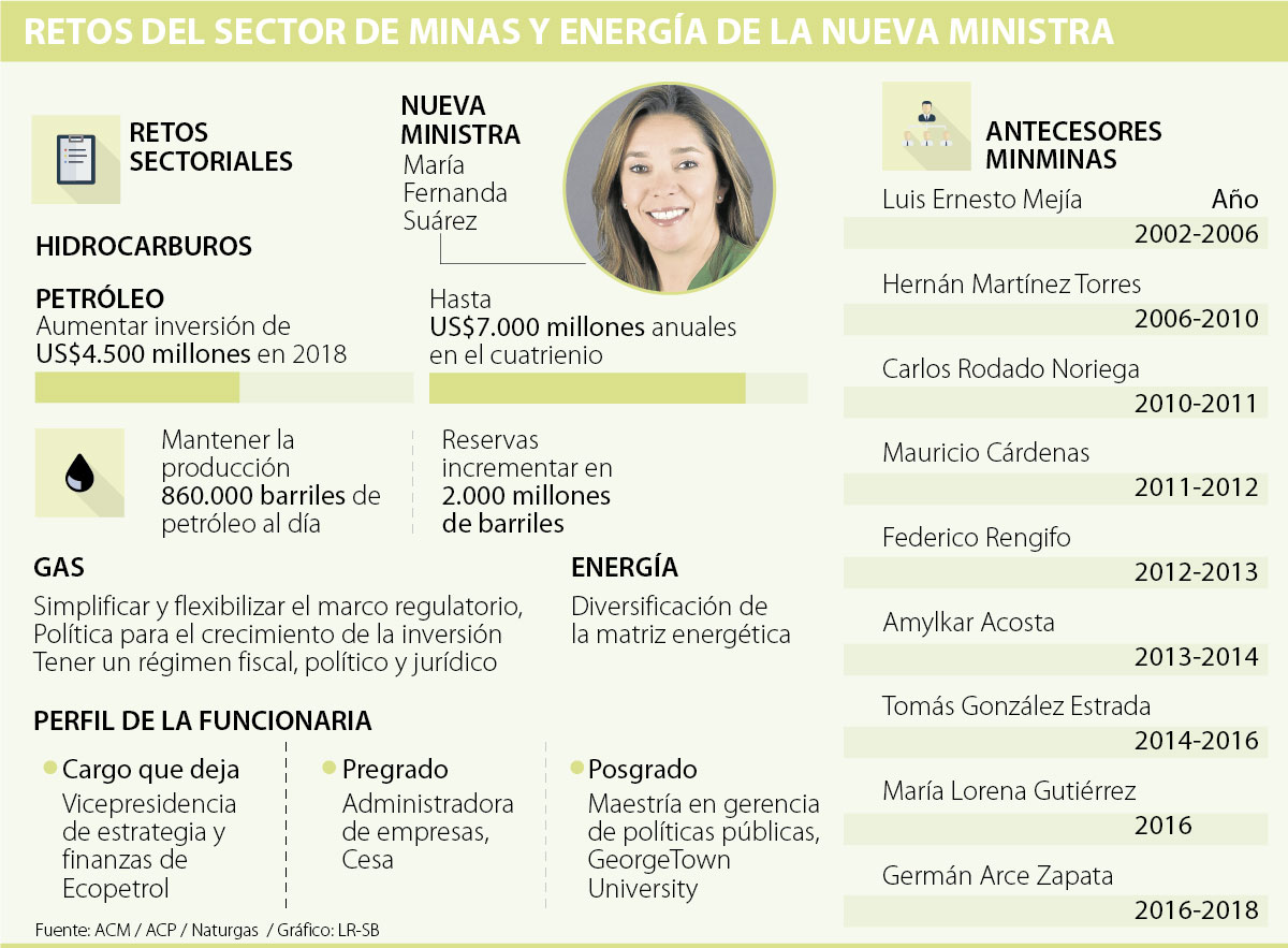 Con la llegada de la nueva ministra de Minas y Energía, la hasta ahora vicepresidenta de Estrategia y Finanzas de Ecopetrol, María Fernanda Suárez, el reto del sector será materializar estos ingresos, a través de mayor inversión y seguridad jurídica, pilares de una serie de estrategias que se deberán adoptar en el Gobierno de Iván Duque.
