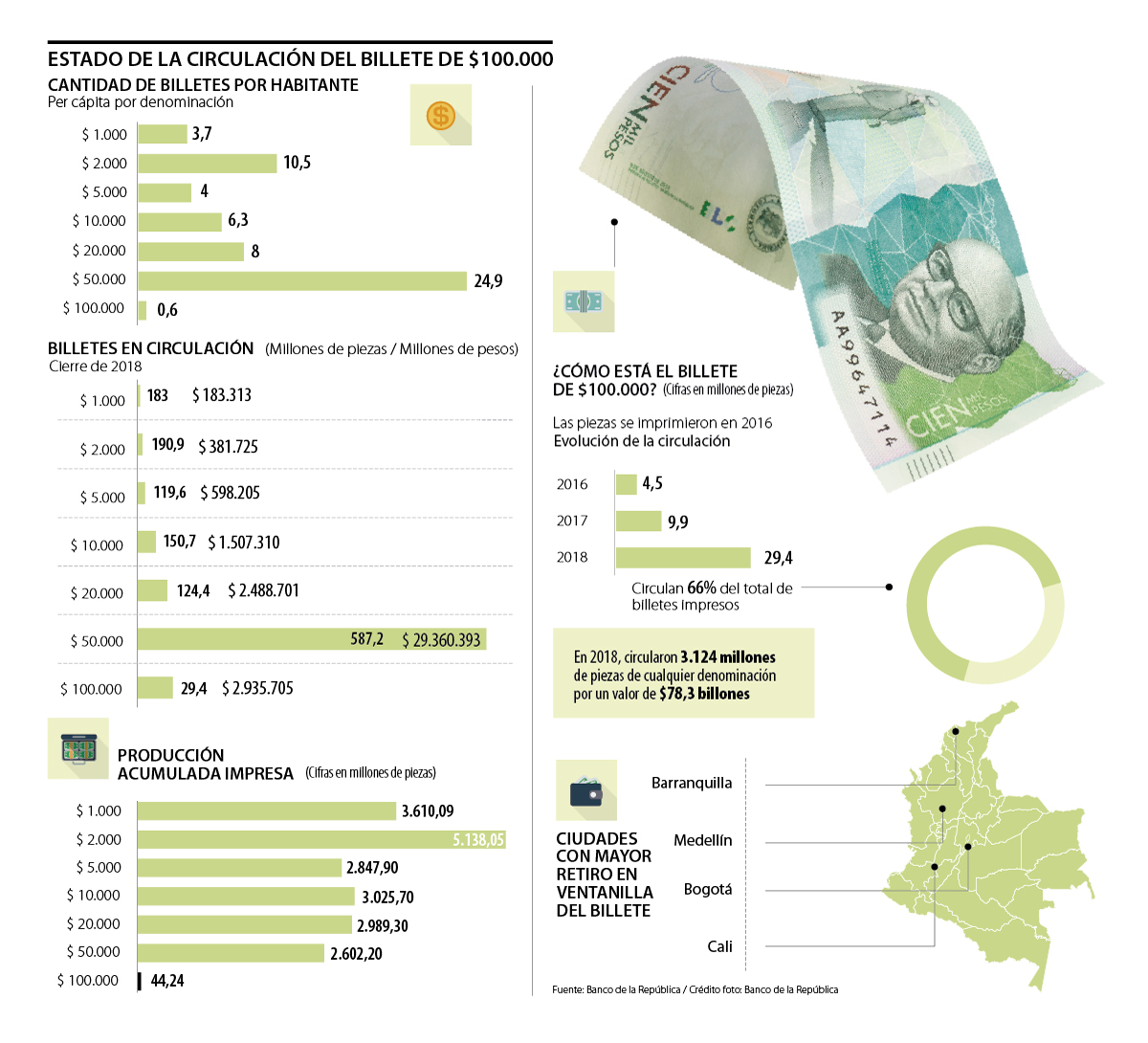 En marzo se cumplen tres años de la puesta en circulación del primer grupo de billetes de $100.000 con el que el Banco de la República quería responder a la creciente demanda de efectivo de alta denominación. Sin embargo, más de 1.060 días después de la emisión de este papel moneda que lleva impresa la imagen del presidente Carlos Lleras Restrepo junto con el Valle de Cocora en Quindío y la palma de cera aún son muchos los colombianos que no han tenido la oportunidad de tenerlo entre sus manos.