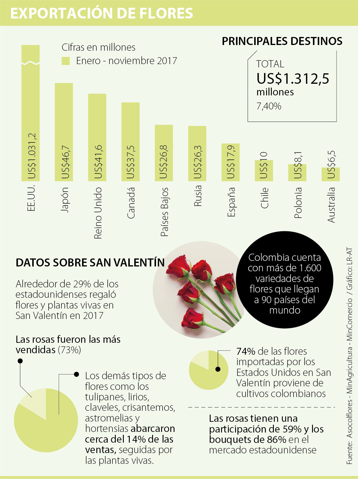 El principal mercado es Estados Unidos. Según Olga Lucía Lozano, viceministra de Comercio Exterior, 74% de las flores que compra ese país para celebrar esa festividad es de origen colombiano.