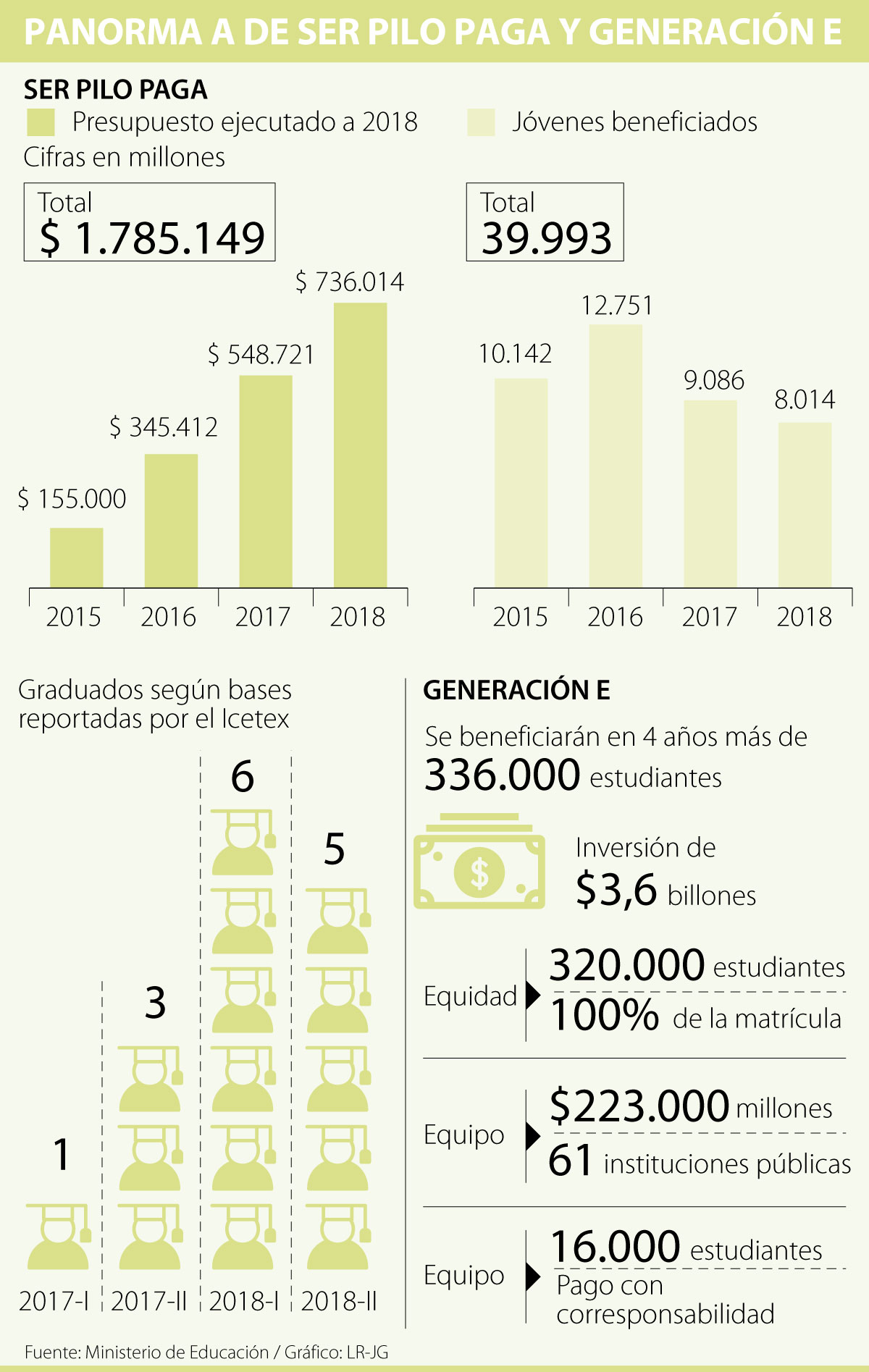 Desde 2014, y a octubre de 2018, ‘Ser Pilo Paga’ ha ejecutado recursos por $1,78 billones, distribuidos principalmente en Bogotá (5.389 pilos), Antioquia (4.610), Santander (3.260) y Atlántico (3.045).