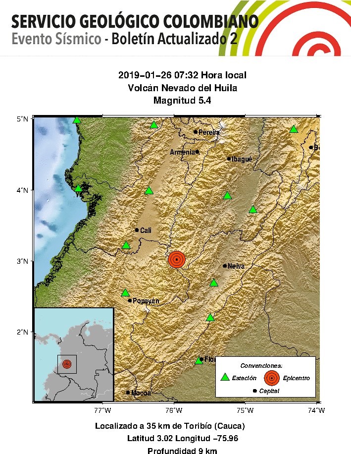 A las 7:32 a.m. ocurrió un sismo de magnitud 5,4, que tuvo como epicentro el Volcán Nevado del Huila. Así lo confirmó el Servicio Geológico Colombiano (SGC) en un tercer boletín emitido esta mañana, luego de haber hablado de magnitudes de 4,9 y 5,2.