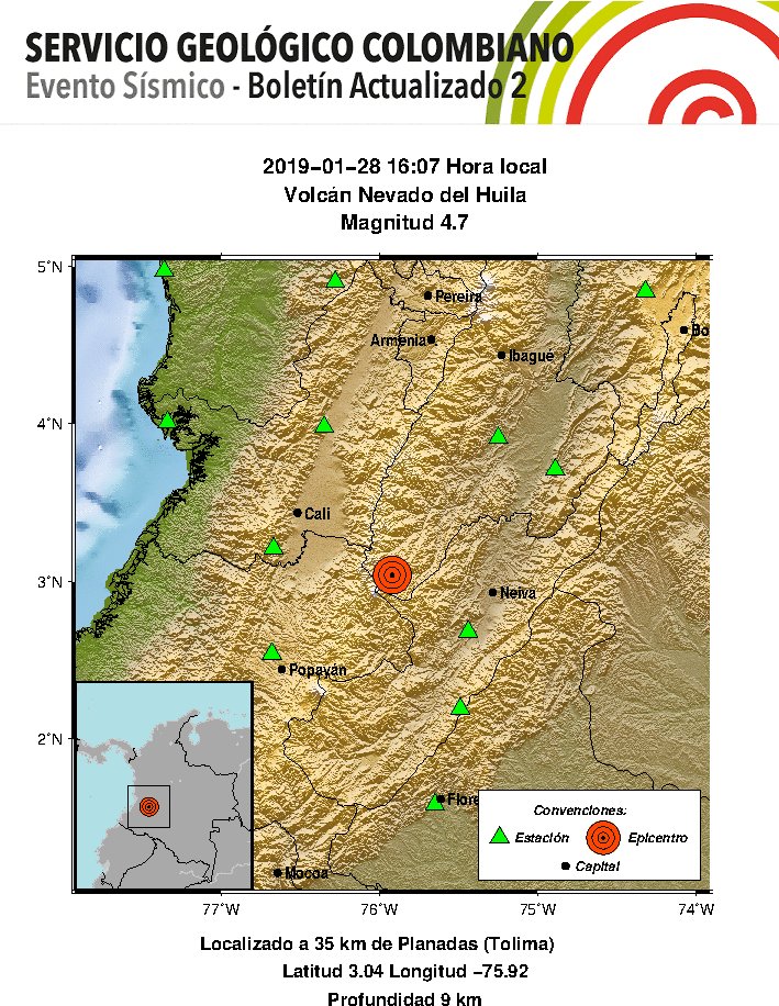 Según el informe de la entidad, el epicentro de este evento sísmico fue en el Volcán Nevado del Huila y su profundidad fue de 9 kilómetros.