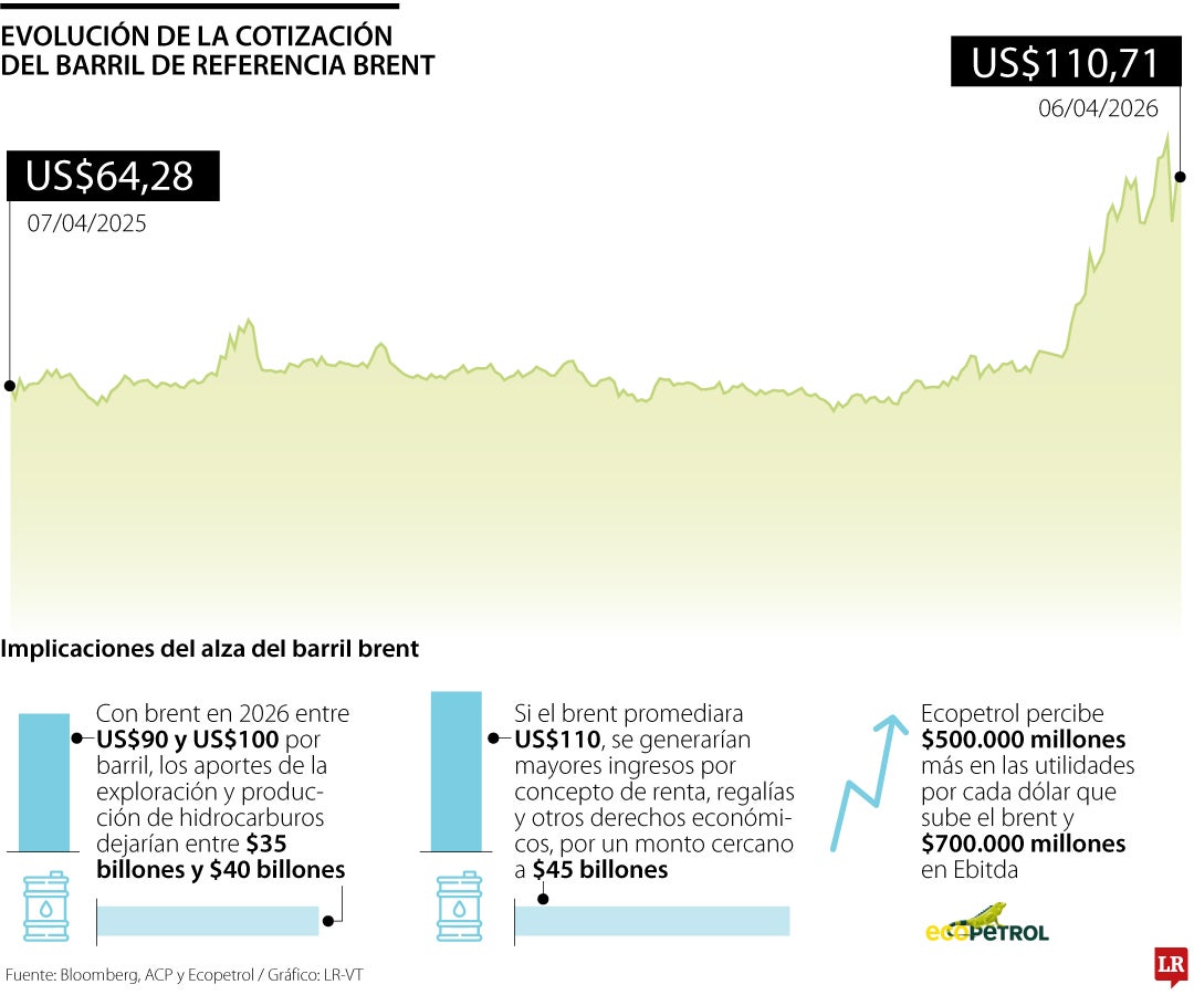 El Ministerio de Hacienda esperaba un alza de US$10 en la cotización del brent, al pasar de US$68 a US$78,7, lo que generaría una mejora de $979.000 millones en los ingresos de la Nación y de $1,35 billones en el balance del Gobierno Nacional Central en 2027.