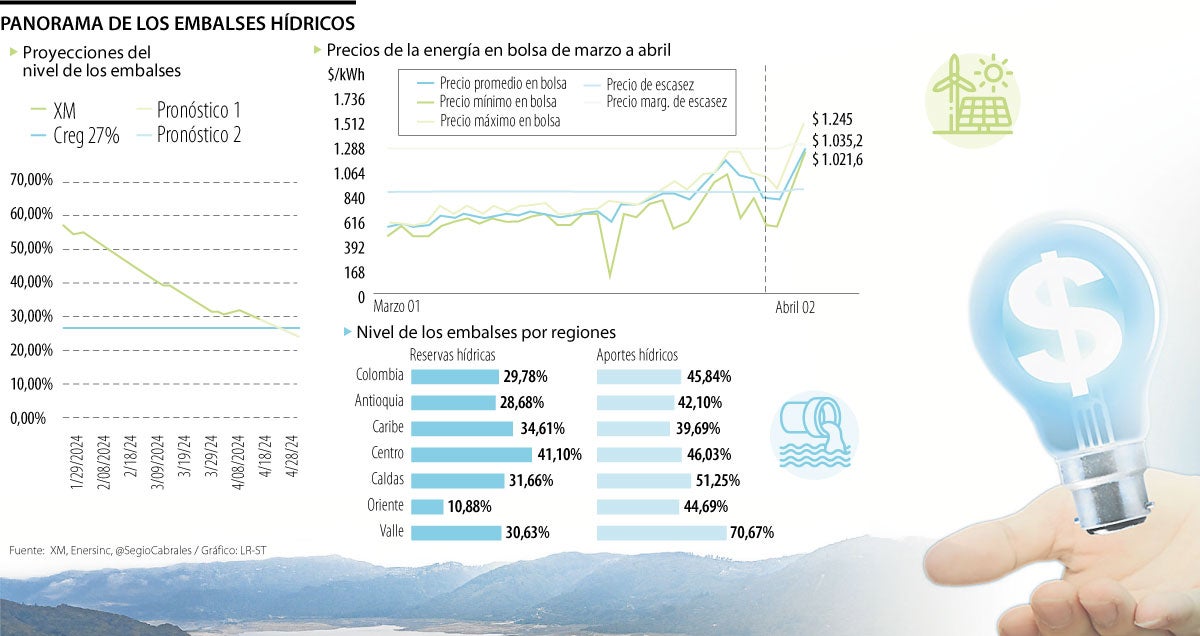 Por su parte, Sergio Cabrales, analista y docente de la Universidad de Los Andes, dijo: “nuestras estimaciones indican que este fin de semana el nivel agregado de los embalses de las hidroeléctricas colombianas llegará a 27%, que es un nivel crítico definido por la Creg”.