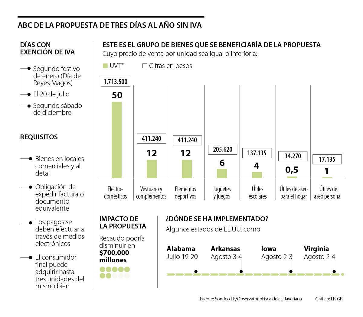 Este es el impacto que calcula el Observatorio Fiscal de la Universidad Javeriana que tendría no cobrar este tributo a ocho categorías diferentes de productos el segundo día festivo del mes de enero (Reyes Magos), el 20 de julio (Independencia) y el segundo sábado del mes de diciembre (época navideña) de cada año hasta 2022.
