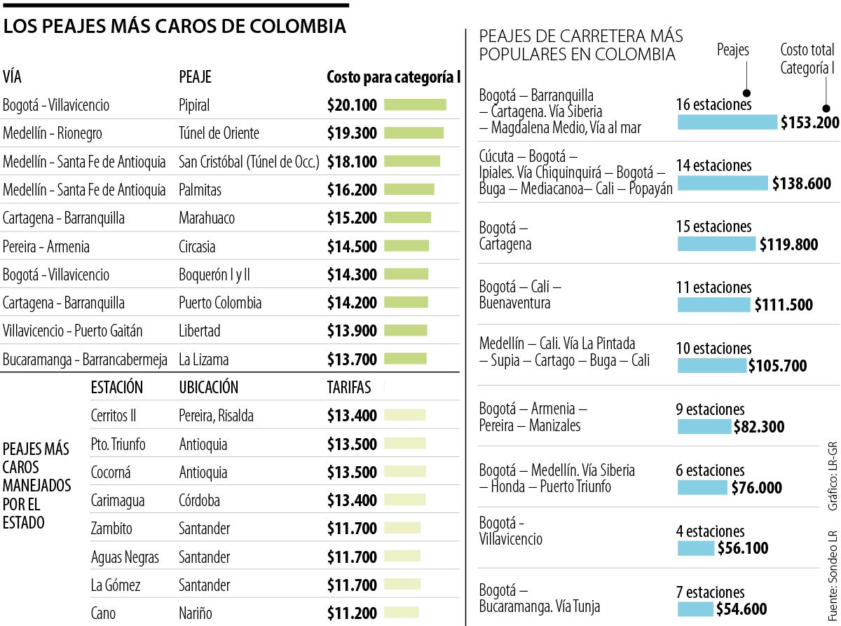 Si se revisan los precios del último reporte de la ANI, la tarifa más alta se la lleva el peaje Pipiral de Bogotá-Villavicencio con $20.100 para la categoría I, seguido por El Guaico en la Autopista Conexión Pacífico 3 con una tarifa de $18.300; el top tres lo cierra el peaje de Aburrá en Medellín, que hace parte del proyecto Autopista al Mar 1, con $18.100.