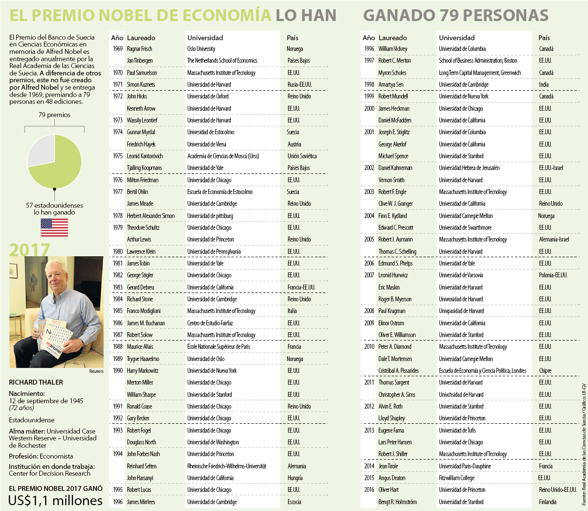 Aunque las apuestas estaban inclinadas por algunos economistas como Robert Hall, Colin Camerer o Nicholas Stern, el Premio del Banco de Suecia en Ciencias Económicas en memoria de Alfred Nobel se lo llevó Richard Thaler, un estadounidense de 72 años. Con este reconocimiento el académico engrosó la lista de 57 americanos que se han llevado el título entre un grupo de 79 personas desde 1969, lo que significa que siete de cada 10 Nobel de Economía nacieron en Estados Unidos.