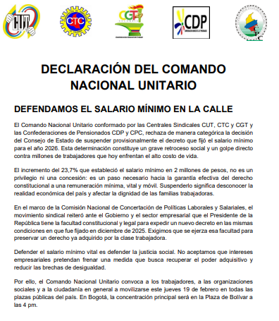 El Comando Nacional Unitario conformado por las Centrales Sindicales CUT, CTC y CGT y las Confederaciones de Pensionados CDP y CPC, rechazó la decisión del Consejo de Estado de suspender provisionalmente el decreto que fijó el salario mínimo para 2026.