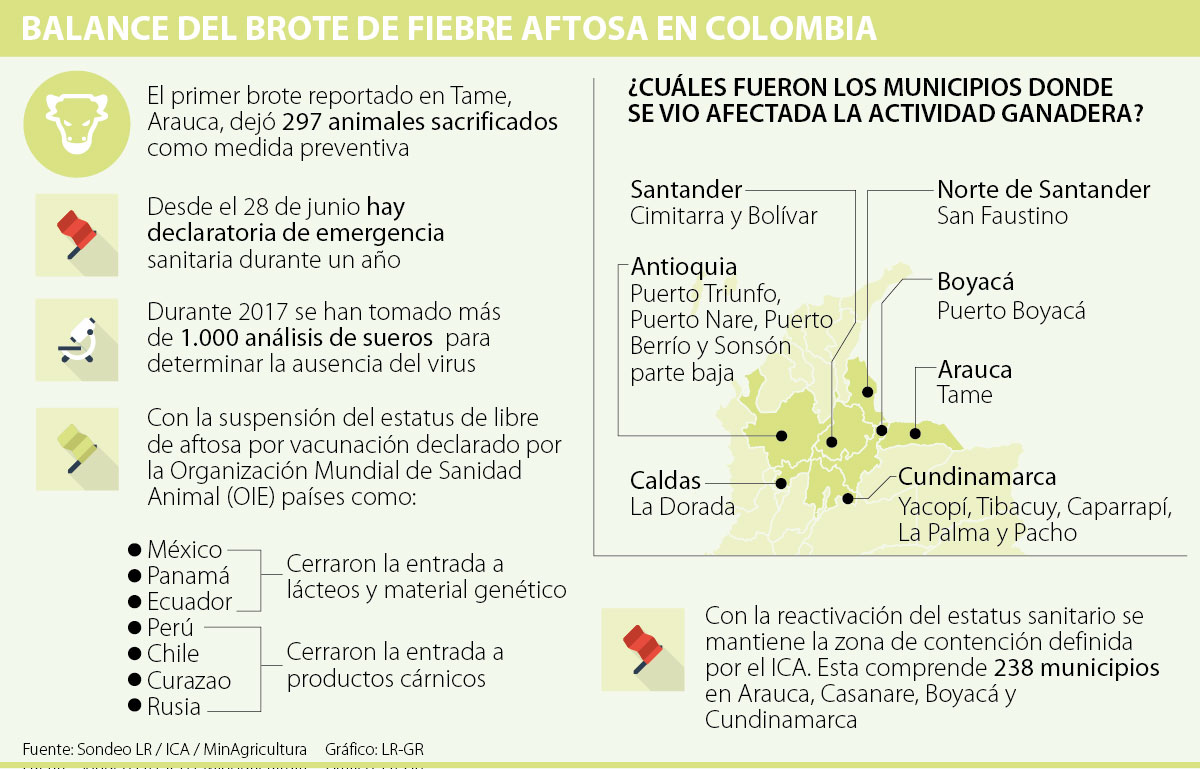 La reactivación del estatus será fundamental para volver a comercializar productos cárnicos y derivados lácteos con países como Rusia, Chile, Perú y Curazao, que a raíz de los brotes de fiebre aftosa que se registraron en Tame (Arauca), Yacopí y Tibacuy (Cundinamarca) y en San Faustino, corregimiento de Cúcuta, entre junio y agosto del presente año, le cerraron las puertas a estas exportaciones.