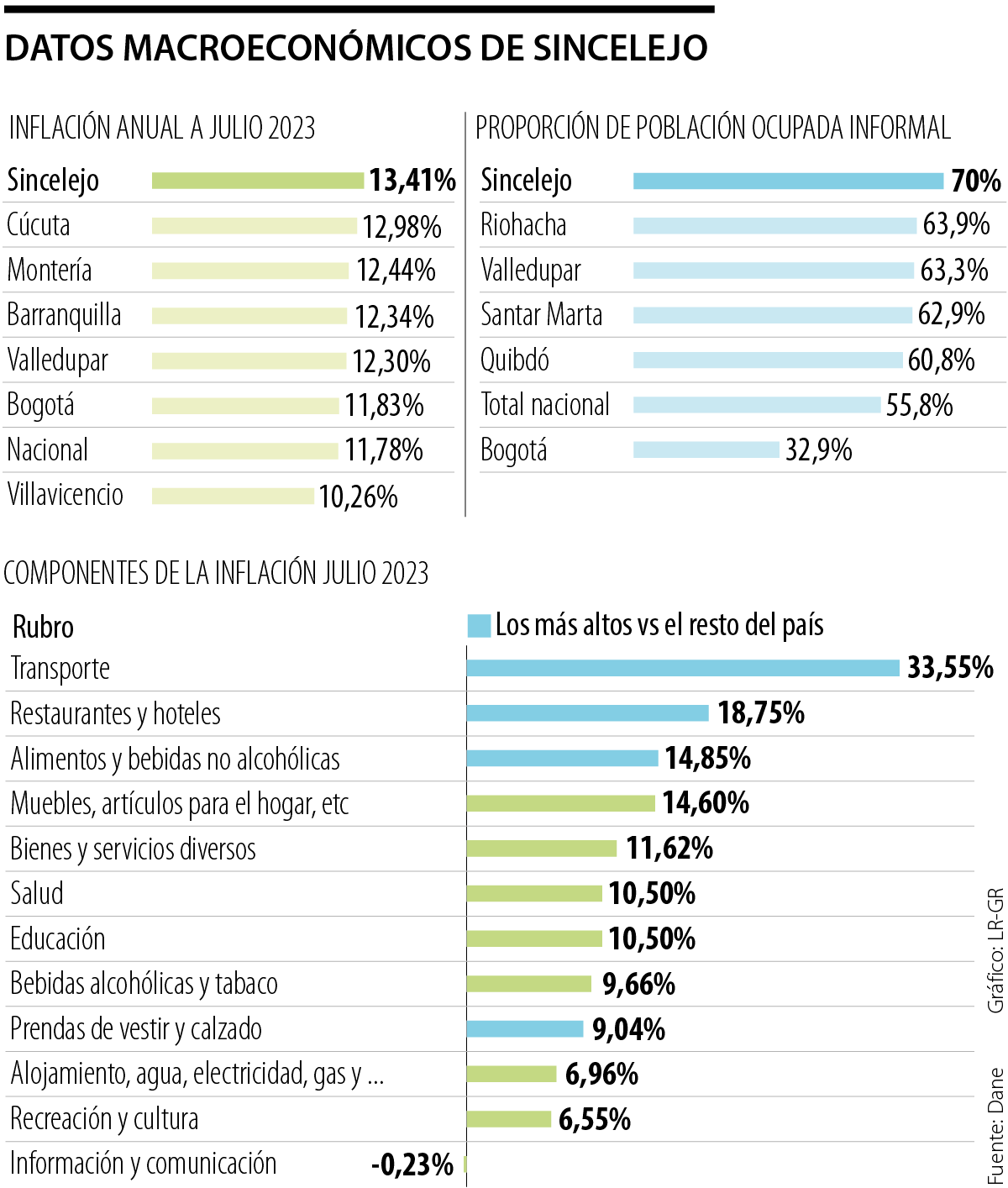 A julio, de acuerdo con la información del Dane, Sincelejo registró una inflación anual de 13,41%, la más alta del país, y con una diferencia de 1,63 puntos porcentuales sobre el promedio nacional (11,78%).
