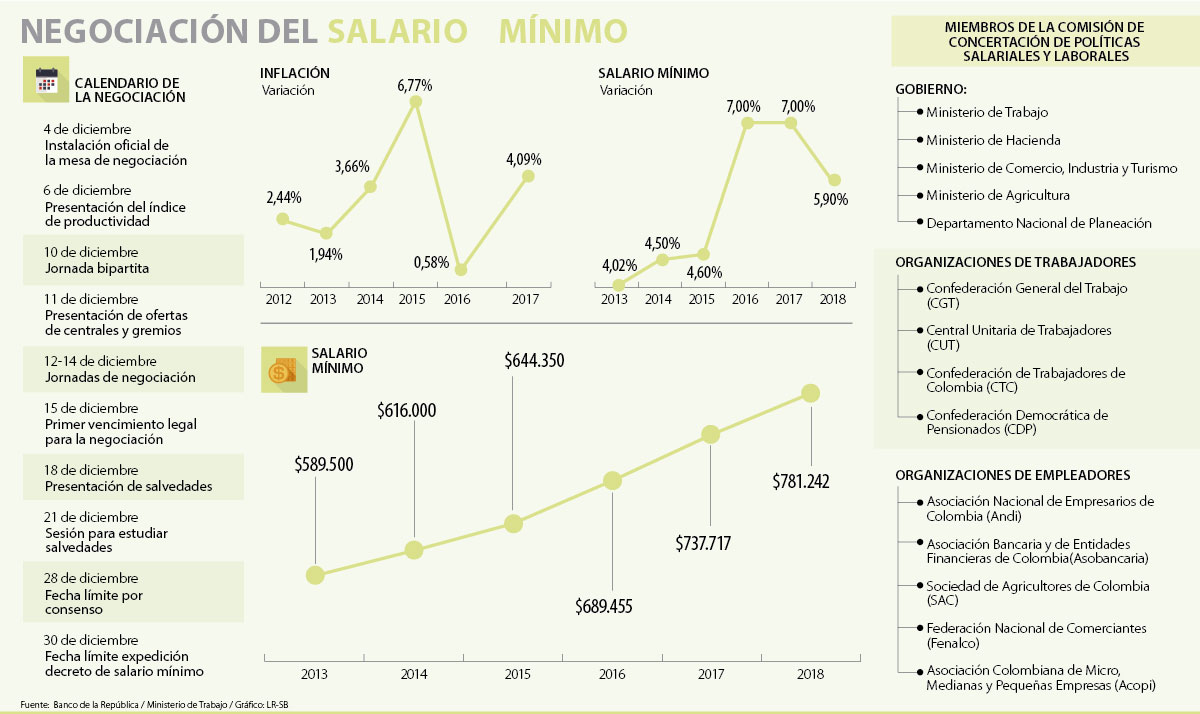 De acuerdo con el cronograma para la negociación del mínimo, la fecha para la presentación de ofertas de centrales y gremios es el próximo martes 11 de diciembre, una vez se tengan los resultados de la variación del IPC para noviembre, lo que permite revisar la inflación estimada, sumado a la presentación del indicador de productividad que entregará el Gobierno el jueves.