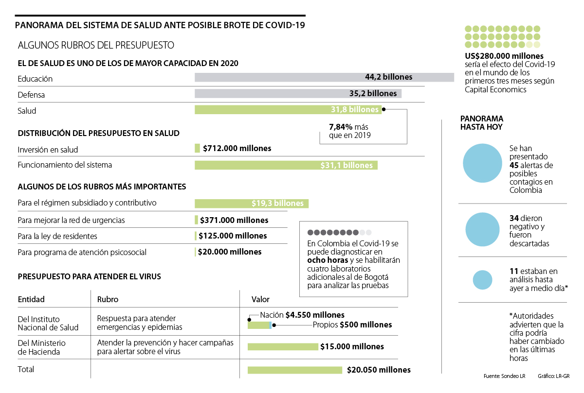 Se estima que el país cuenta con $20.050 millones para atender la prevención y posible brote del Covid-19. $5.050 millones derivados del presupuesto del renglón de emergencias del Instituto Nacional de Salud y $15.000 millones aprobados por el Ministerio de Hacienda.