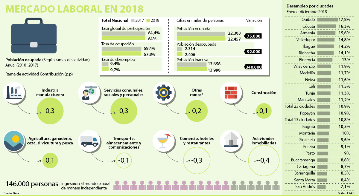 El alto incremento de la población inactiva en el país y la baja demanda de puestos de trabajo en algunos sectores de la economía impactó en la tasa de desempleo del año pasado. Así lo reveló el Departamento Administrativo Nacional de Estadística (Dane), que aseguró que para el año pasado la cifra de desempleo se ubicó en 9,7%. Este dato se tradujo en un incremento de 0,3 puntos porcentuales, frente a la variable de 2017 cuando fue de 9,4%.