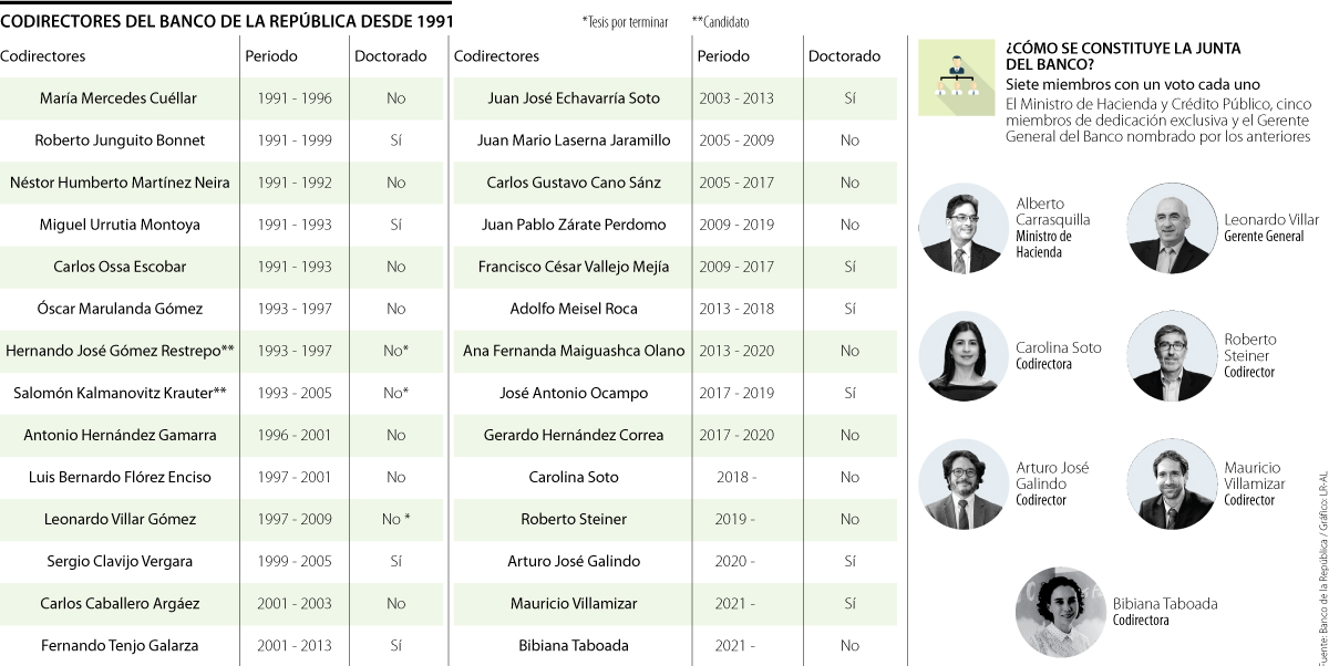 Con la designación de ayer del presidente Iván Duque de Mauricio Villamizar y Bibiana Taboada como nuevos codirectores del Banco de la República, en reemplazo de Ana Fernanda Maiguashca y Gerardo Hernández, quienes ya cumplieron su periodo de cuatro años, solo 10 de los 28 miembros que ha tenido en total la Junta Directiva desde 1991 han contado con un doctorado.