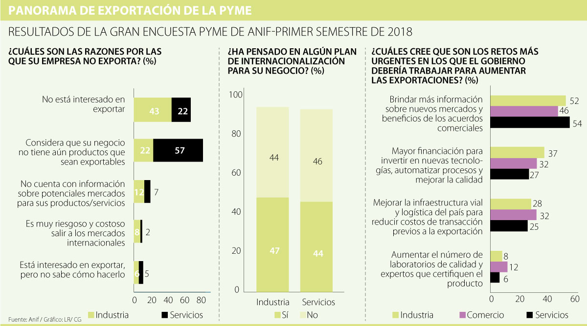 La encuesta también detalló que mientras que en el sector industrial 43% de las compañías indicó que no estaba interesado en comerciar hacia el exterior, en el caso de las empresas de servicios solo 22% aseguró no tener interés es internacionalizar su oferta.