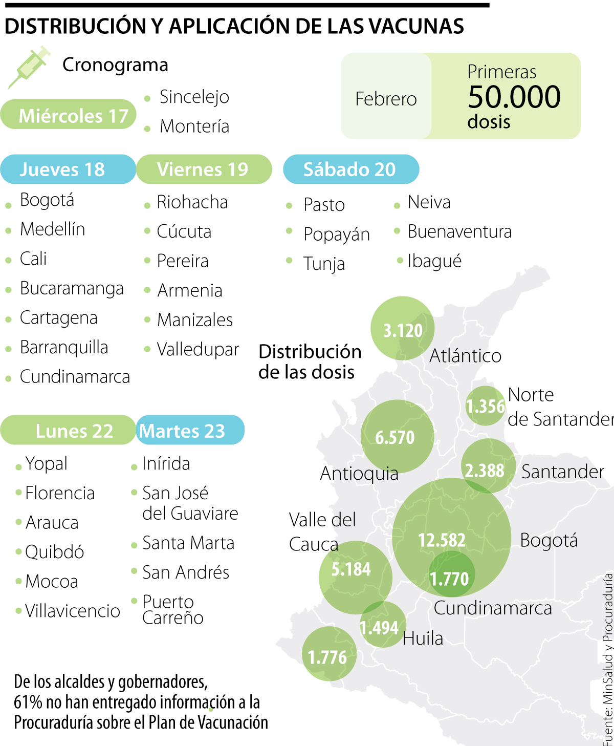 El jueves 18 de febrero llegarán las dosis a las principales ciudades del país: Bogotá, Medellín, Cali, Bucaramanga, Cartagena, Barranquilla y Cundinamarca. El viernes 19 será el turno de Riohacha, Cúcuta, Pereira, Armenia, Manizales y Valledupar. El sábado las dosis llegarán a Pasto, Popayán, Tunja, Neiva, Buenaventura e Ibagué. El domingo no se realizará la jornada de vacunación y el lunes se continuará con Yopal, Florencia, Arauca, Quibdó, Mocoa y Villavicencio.
