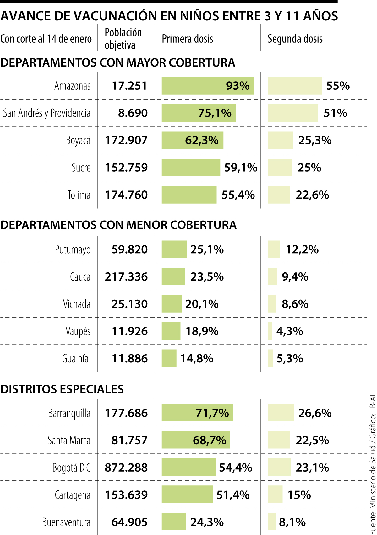 Esta situación también se repite en la población entre 3 y 11 años; de hecho, solo 12 departamentos llegan a la mitad de los niños vacunados con una dosis, siendo los de mayor cobertura Amazonas (93%) y San Andrés y Providencia (75%). Al otro extremo está Guainía, Vaupés y Vichada con la menor cobertura, menos de 20%.