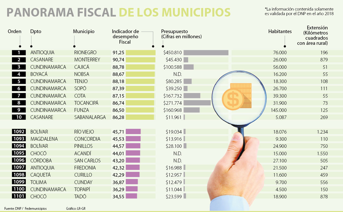 La generación de recursos propios es otro indicador que tienen a favor los municipios mejor ubicados. Por ejemplo, Rionegro, Monterrey, Nobsa, Sopó y Cota, tienen resultados por encima de 90 puntos.