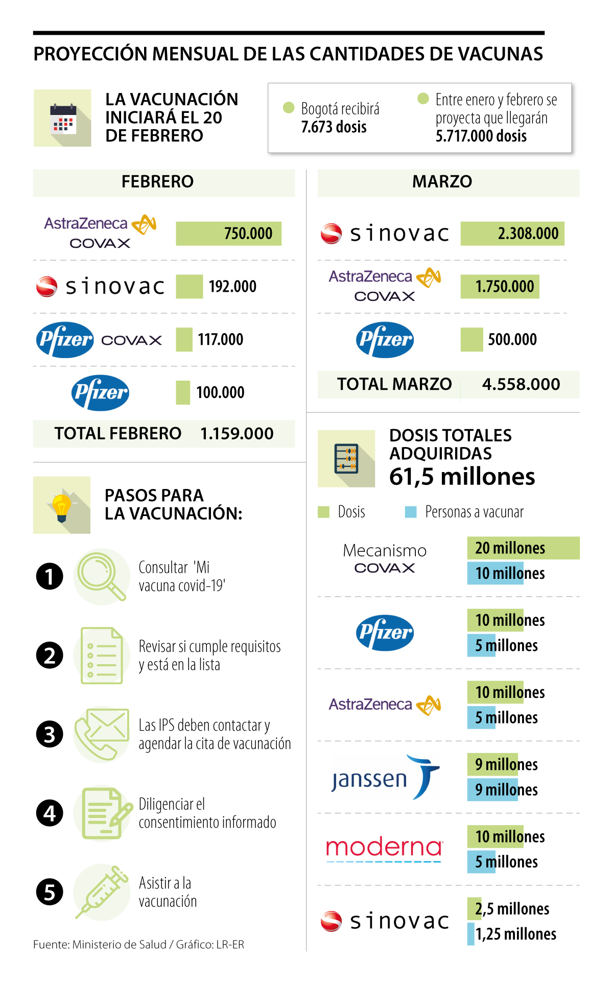 Entre tanto, el Ministerio de Salud dio a conocer que, dentro de sus proyecciones, en febrero llegarían 1,15 millones de vacunas así: 750.000 de AstraZeneca-Covax, 192.000 de Sinovac,117.000 de Pfizer-Covax y 100.000 de Pfizer bilateral, estas serían 822.000 dosis más de las que se habían proyectado anteriormente para este mes (337.000).