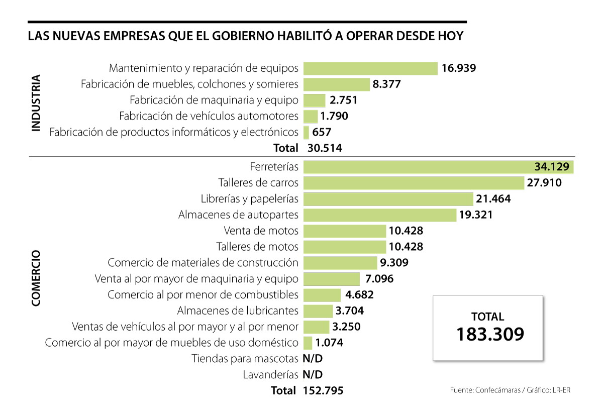 En total, según Confecámaras, son 183.309 empresas que hacen parte de estos sectores de la economía, y que conforman el universo de sociedades de las que usted podría hacer uso, si lo requiere, a partir de hoy, siempre y cuando la administración local les haya dado el permiso.