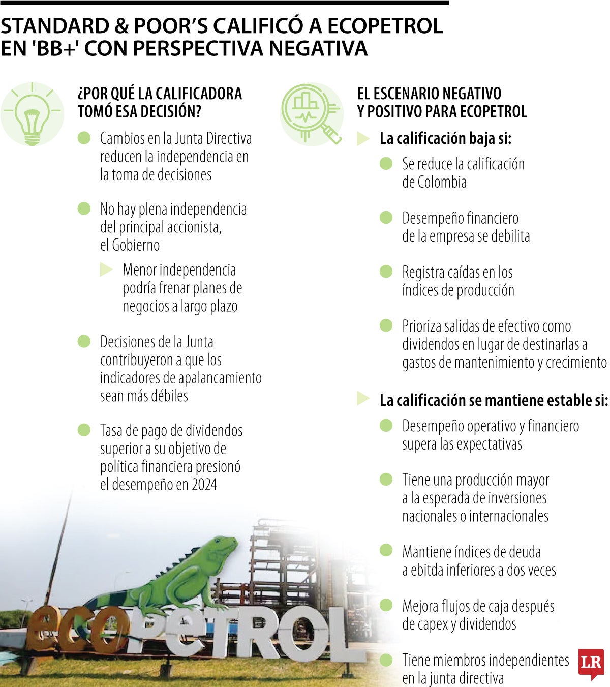 Standard & Poor’s Global Ratings confirmó que la calificación de Ecopetrol se ubicó en 'BB+', con perspectiva negativa, al igual que la tendencia en cuanto a la calificación soberana del país.